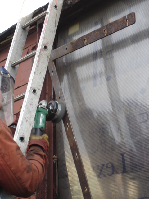…and painted with primer. Flexible boarding was temporarily installed to keep the van weathertight until the next working session. A broken weld, fixing the diagonal brace to the door hinge on the right-hand door, requires attention.