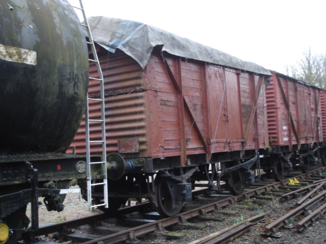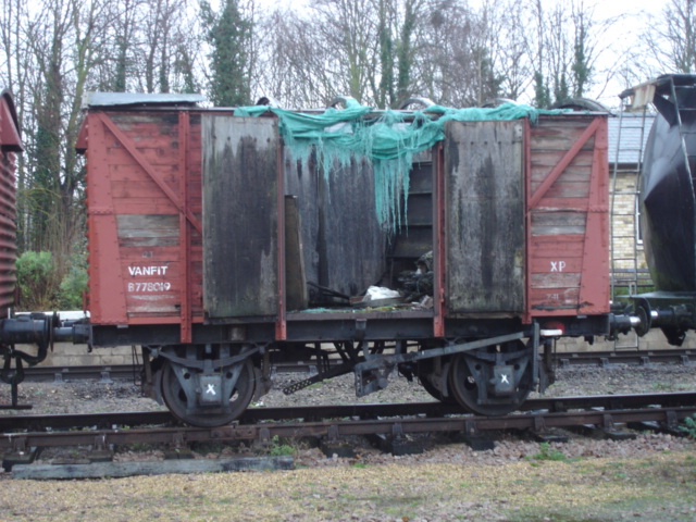This week we undertook a particularly important task: weatherproofing BR ‘Vanfit’ B778019 as much as possible. This van, located at Ferry Meadows station, is in something of a precarious state as can be seen in the photo above. It has been without a roof for several years and has been deteriorating, so it was an early priority for at least some kind of temporary weather protection. The recent re-roofing of a stores van at Wansford meant a suitable heavy-duty tarpaulin was now available for the purpose, at no cost to the railway/group.