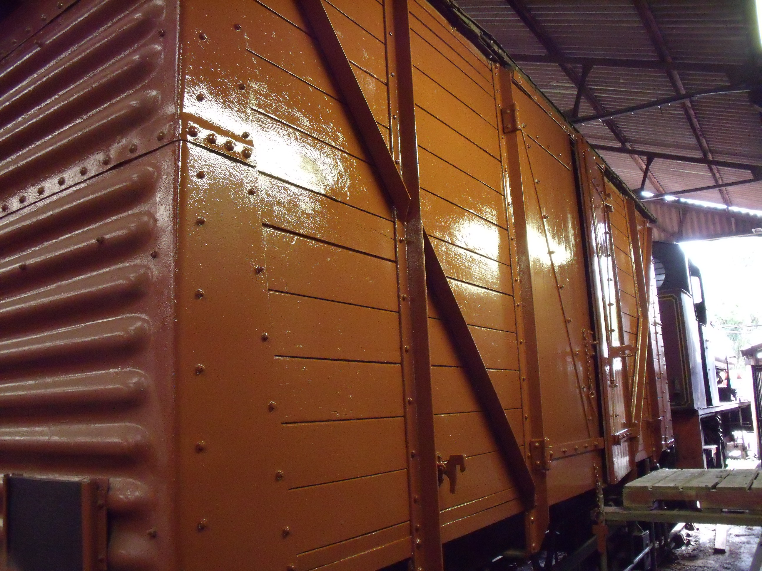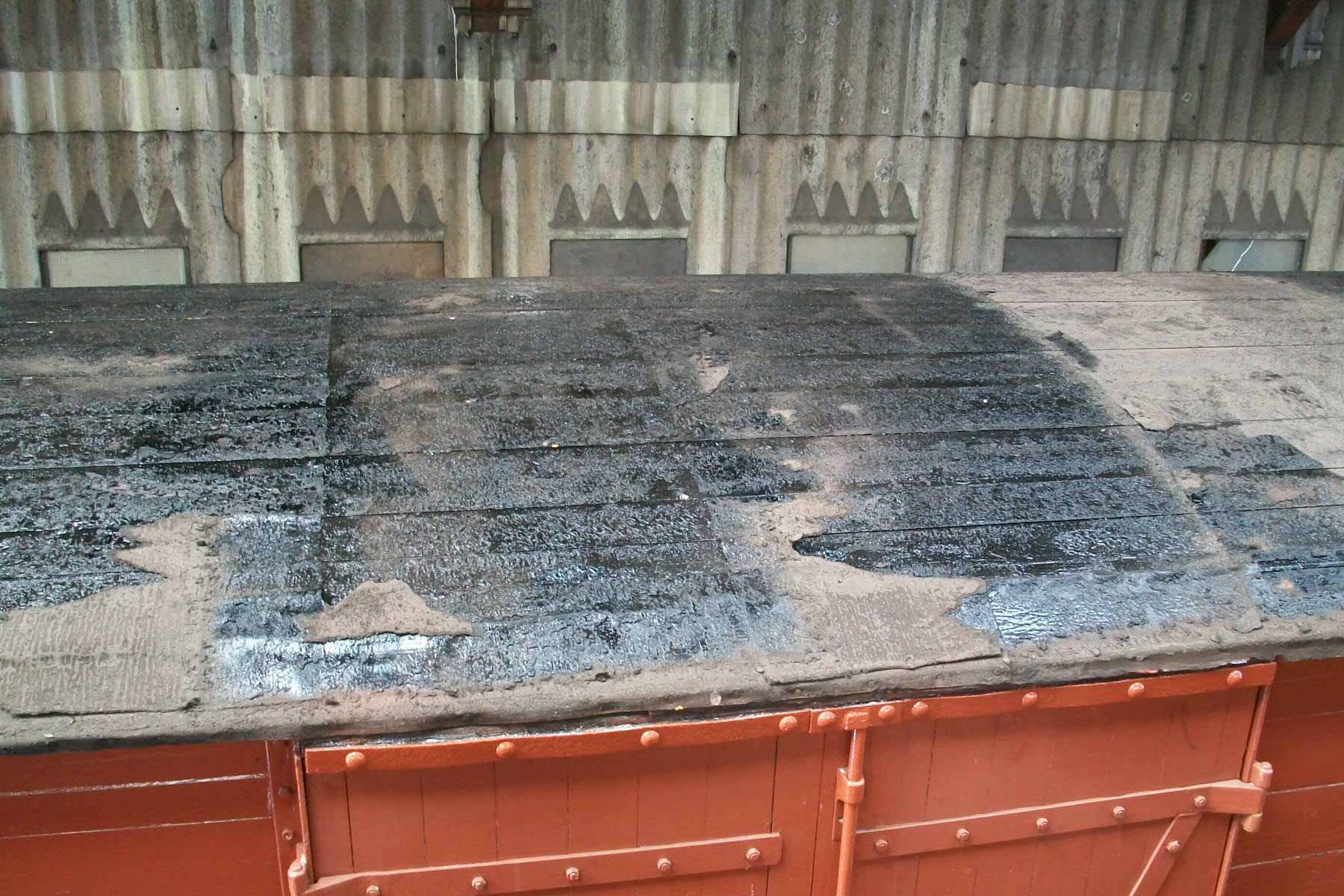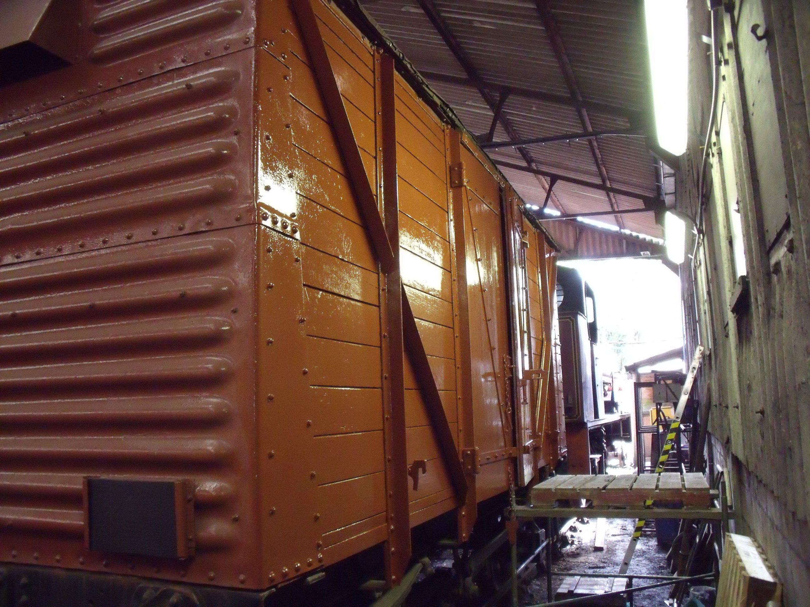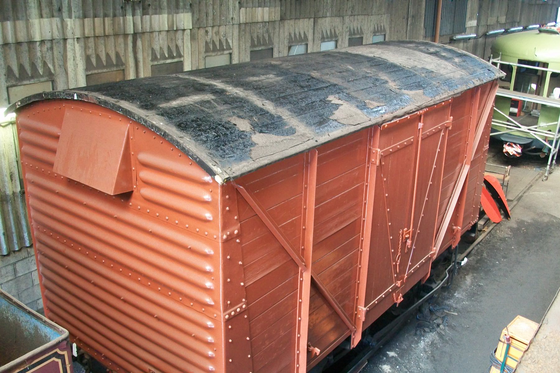 Viewed from the German tank engine in the shed, ‘852 looks strangely like a model! However this vantage point allows us to see that a very good start has also been made on stripping the old roofing felt, ready for a new canvas. Some stubborn patches remain, we hope to scrape these off over the coming weekend, as well as removing the end roof hoops for restoration. Once these preparation jobs are complete the new canvas can be applied, which is a job scheduled for next weekend if the canvas arrives in time. Note the corrugated ends on this van, made with three sections rivetted together rather than two, the latter is a much more common arrangement on these vans. Three end sections was an early design feature, borne out by the 1952 build-date of this van. (Photo courtesy of Tim Hobman).