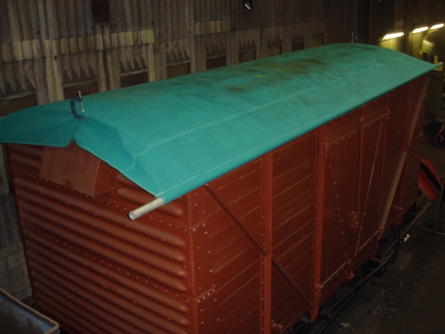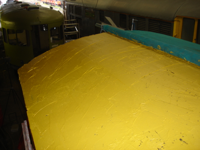 We then retreated from the roof to let the adhesive work its magic, which will be left to cure for a week or two. Finishing strips (including the restored curved roof hoops for the ends) will be installed once the adhesive is dry, then several coats of paint will be applied to seal the roof and make it properly watertight.