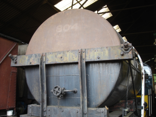 The plan was then to work on the ex-LMS ‘Medfit’ M470944 for the rest of the day. Unfortunately it is now temporarily being used to store waste materials in the yard which is less than ideal when we are trying to undertake restoration work on the vehicle. It was also located directly adjacent to the excavations and preparatory works for the new locomotive inspection/preparation pit which we are delighted to see is now underway! So we thought it best to stay out of the way for the day and drop on to our fall-back project, the repaint of “Esso” oil tank No.1914. As time was short, we restricted ourselves to removing the old paint from the top half of one end, in the process uncovering its old Air Ministry number, 804.