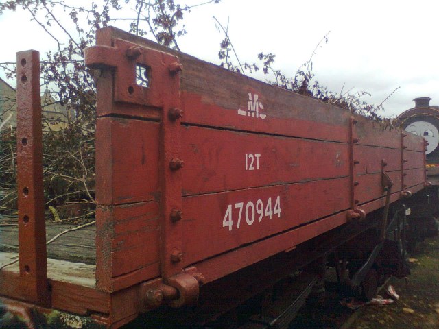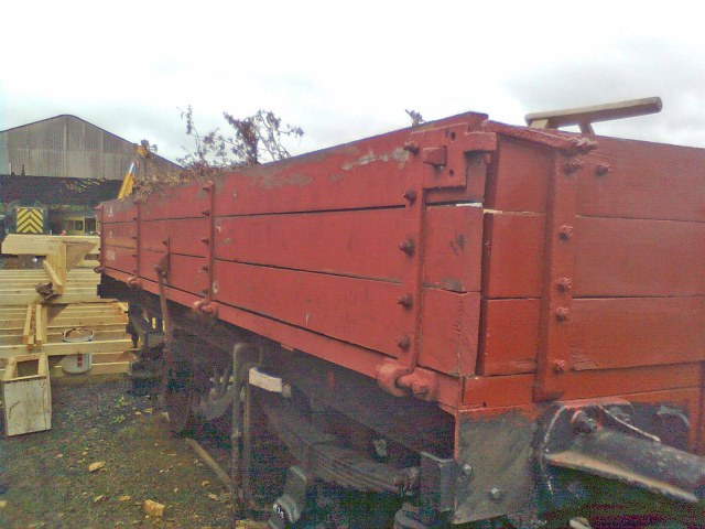 The ‘good side’ viewed from the other end before repainting from LMS ‘bauxite’ livery, to BR. One of the prepared end stanchions, ready for their new boards, is also in view. The new end timbers are already cut and primed, and after topcoating will be ready to bolt straight on.