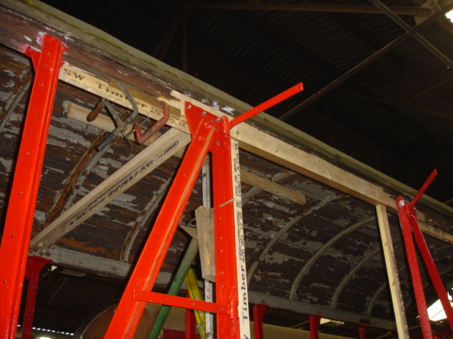 A bit of a tricky task this week; putting right damage on CCT 37071 that was received in a collision many years ago. In the photo it can be seen that the timber top rail is completely smashed. Less obvious is that the steel stanchion is pushed inwards considerably, and that this section of the roof had dropped slightly. As this timber is helping to hold the roof up, it is important we repair it and make it as solid as possible. Perhaps it is just as well that this wagon was always intended to be used in a non-operational role.