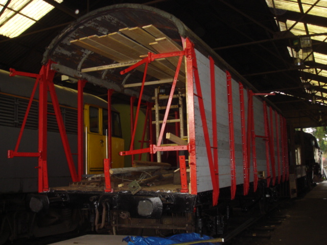 During the Diesel Gala in mid-October, we completed planking the north side. The planks were primed before installation, to be followed by undercoat and topcoat after completion of the roof (we don’t want to spoil the finish by dripping roof paint down the sides). It may also be seen that the north side of the chassis has now received black underframe gloss paint.