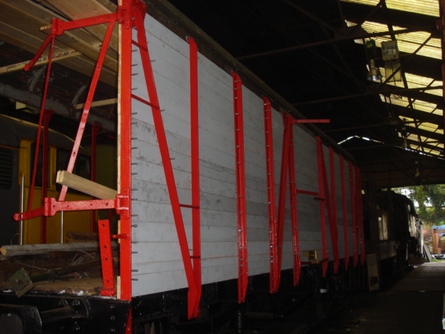 A closer view of the north side; note we have blanked over the central side doors to provide greater structural integrity at this point, where the top rail structural timber has been repaired as part of this restoration. Dummy doors will be installed over the blank panel in the centre, so externally there will be no visual difference.