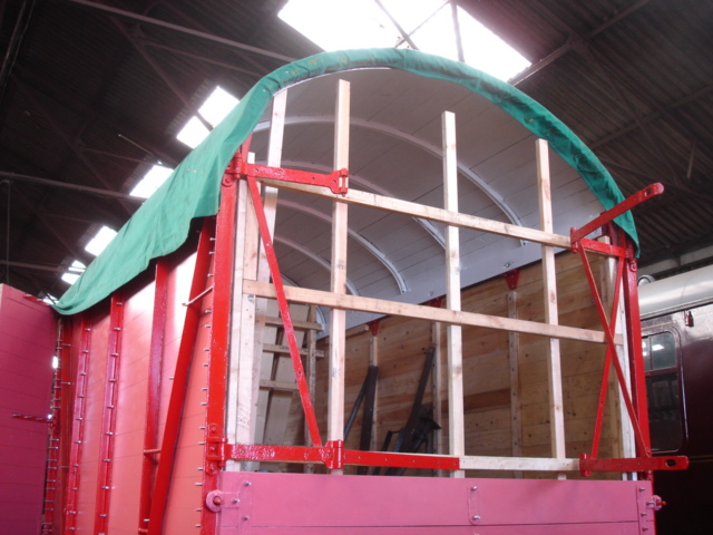 The canvas has now been pinned back at the ends, revealing the roof profile again for the first time in several months. This is to enable the end door cladding to be installed over the studwork, with the canvas tucked inside. Like the side doors mentioned above, the end doors will be non-operational replicas to give the correct appearance, but be a lot more weathertight, simpler and quicker to construct.