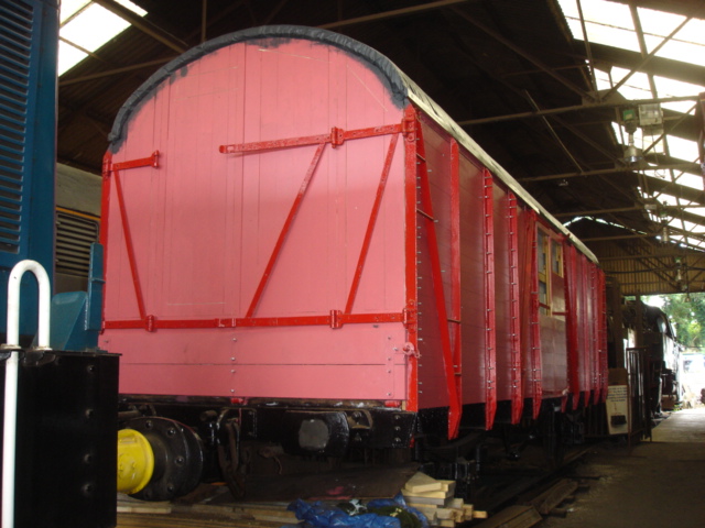 The above photo more-or-less covers everything in this report! Despite the short nature of this update however, a fair bit of work has been completed. The roof canvas has received its final coat of undercoat, and is now ready for the topcoats to commence. The dummy end doors and the dummy side doors have been painted up to undercoat, and the horizontal lines have been scribed into the ends to give the impression of the end door structure and “Octopussy” personnel doors. This can just about be discerned above the buffer of the Class 14 diesel in the foreground. The holes have also been drilled for the final bolts in the bodyside, which can be fitted at the next opportunity.