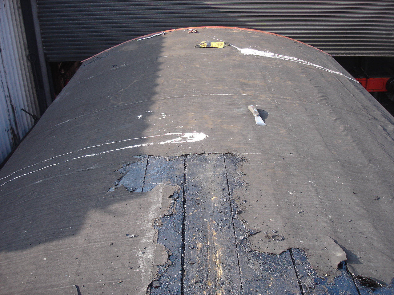Above: Attention then turned to the roof, the seams of the roof covering being in poor condition. A day was spend stripping the old covering, which had been adhered directly to the roof using bitumen adhesive. The life-expired covering will be replaced with a 2-layer roof felting system, that will allow the felt and the roof boards to expand and contract at different rates without breaking up, plus hopefully make it a lot easier to renew the felt in future when replacement is required!