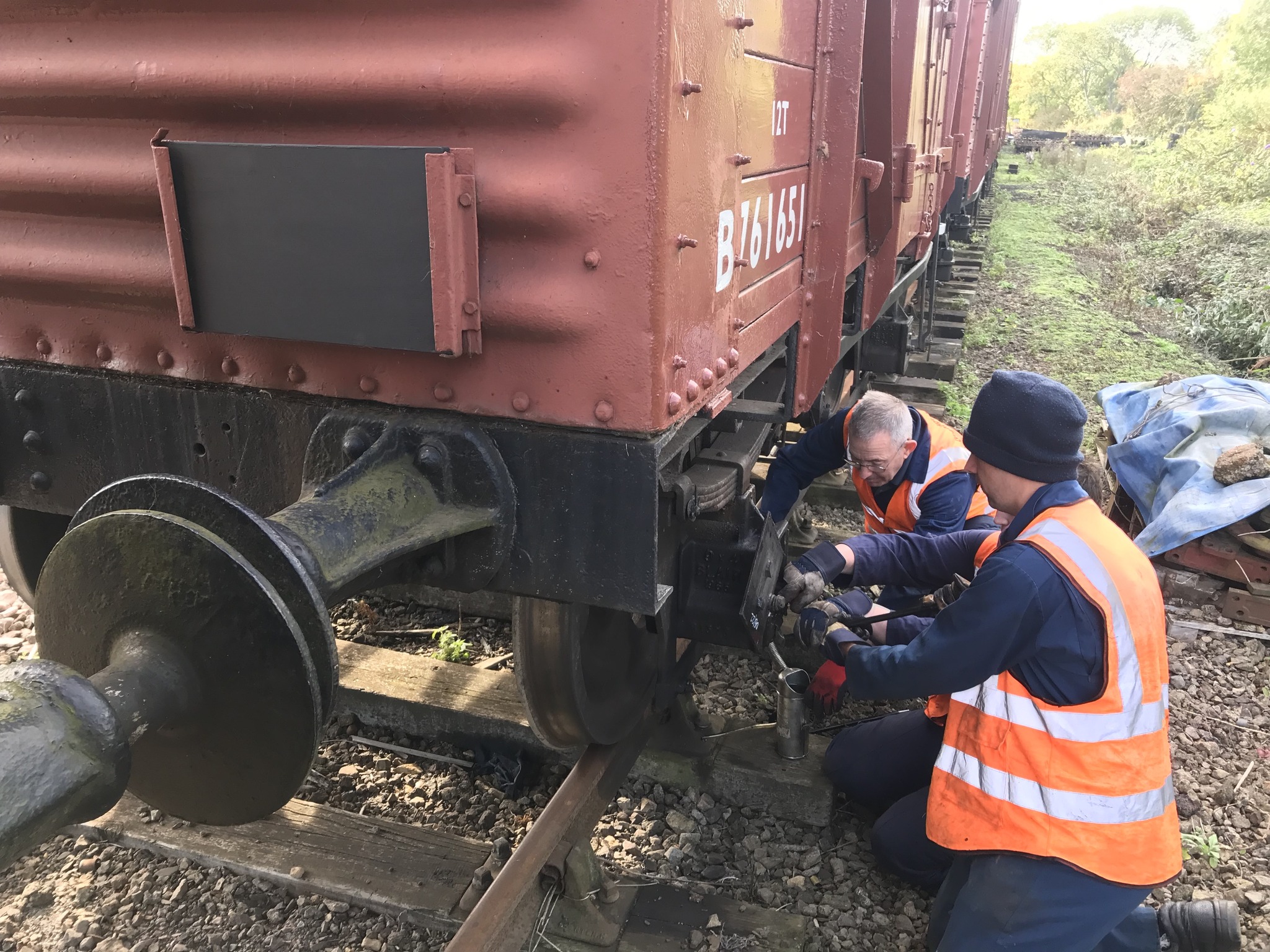 Early October saw preparation for and the running of the third and final Freight Driving Experience of the year a quick repaint on the south sides of the two MOD open wagons to eliminate the ‘patches’ around the signwriting. They were rubbed down and painted in fresh Bauxite. Replacement label boards fitted to vans missing them as well as checking and oiling the rake ready for the experience.