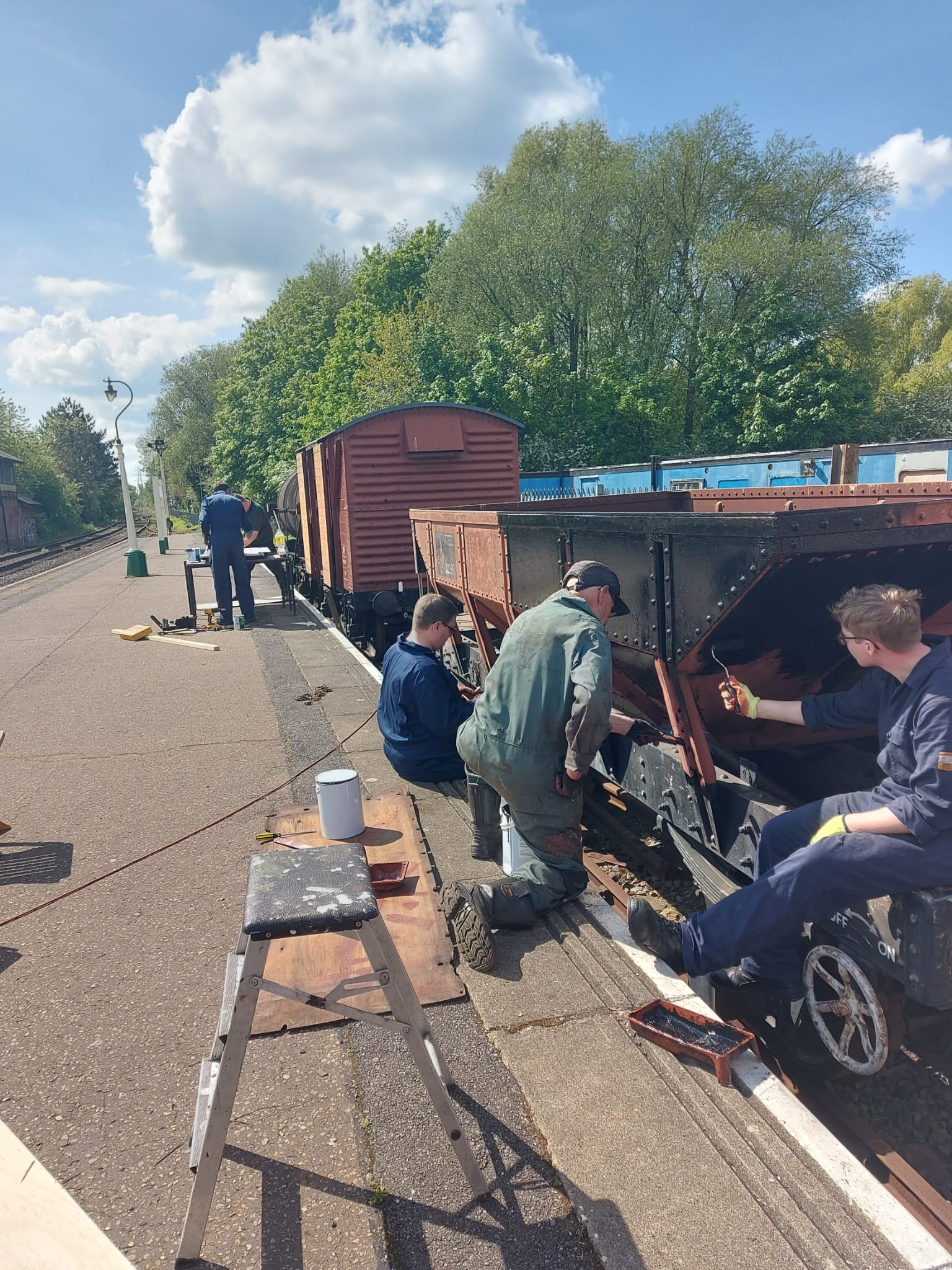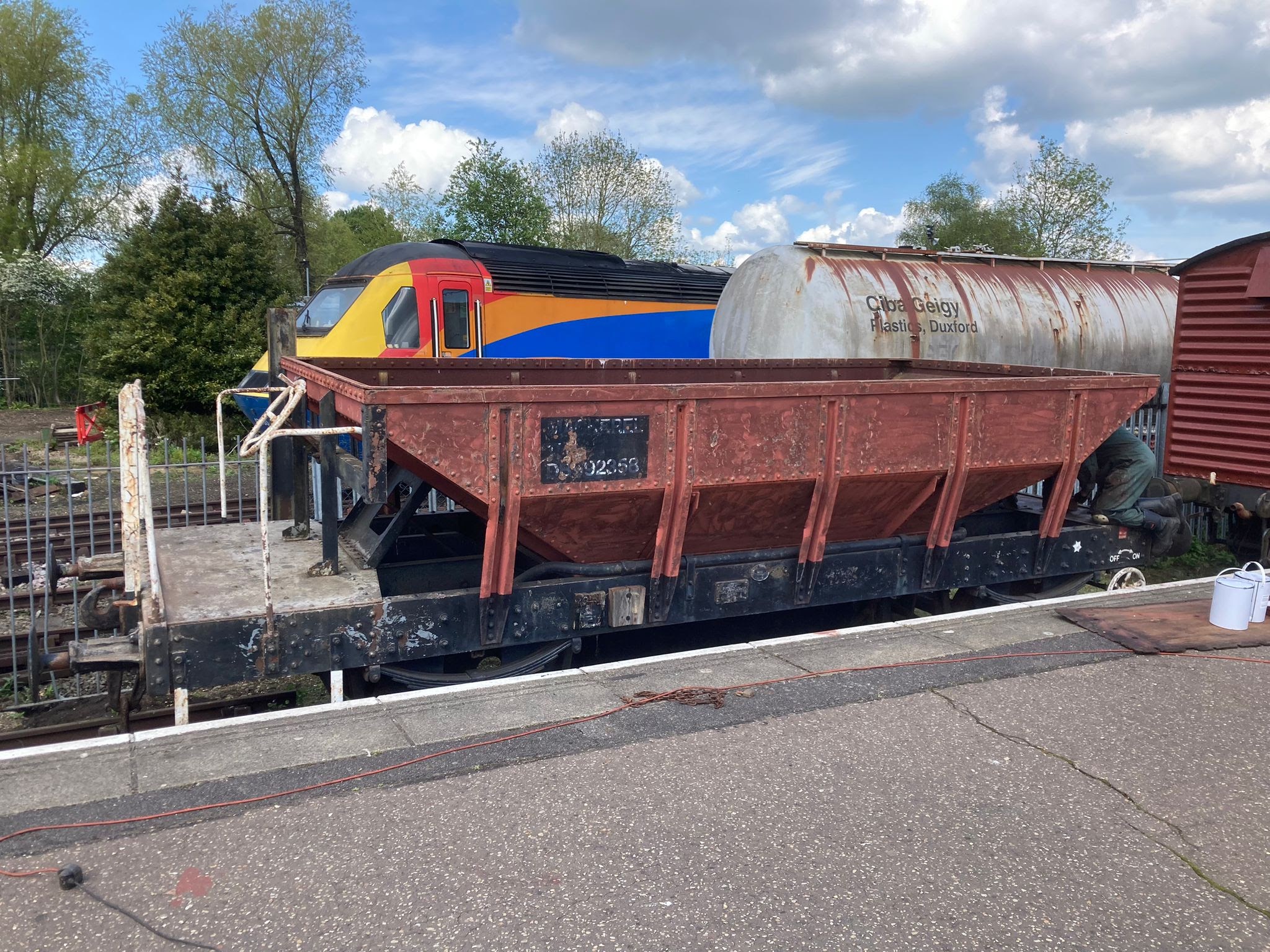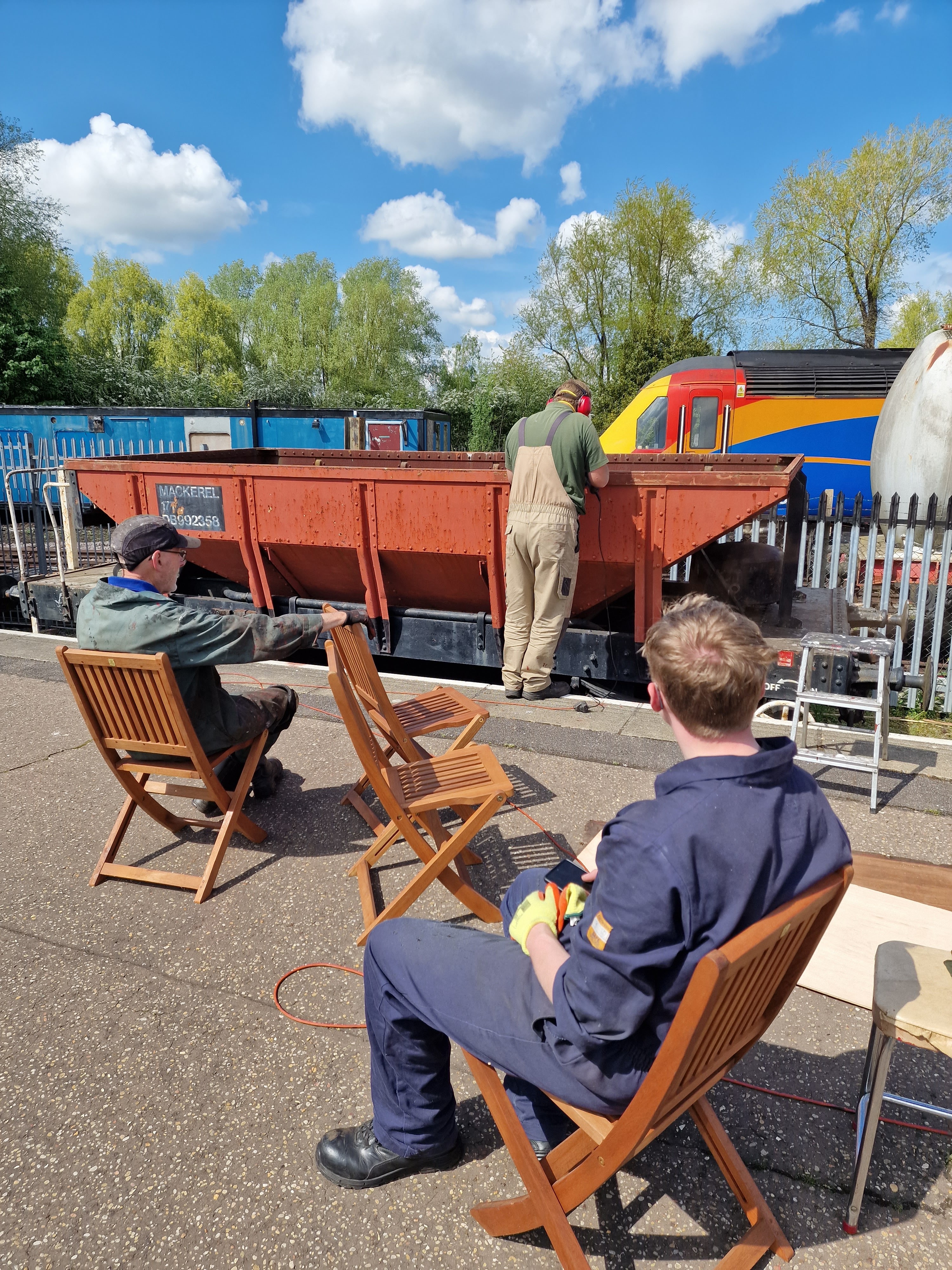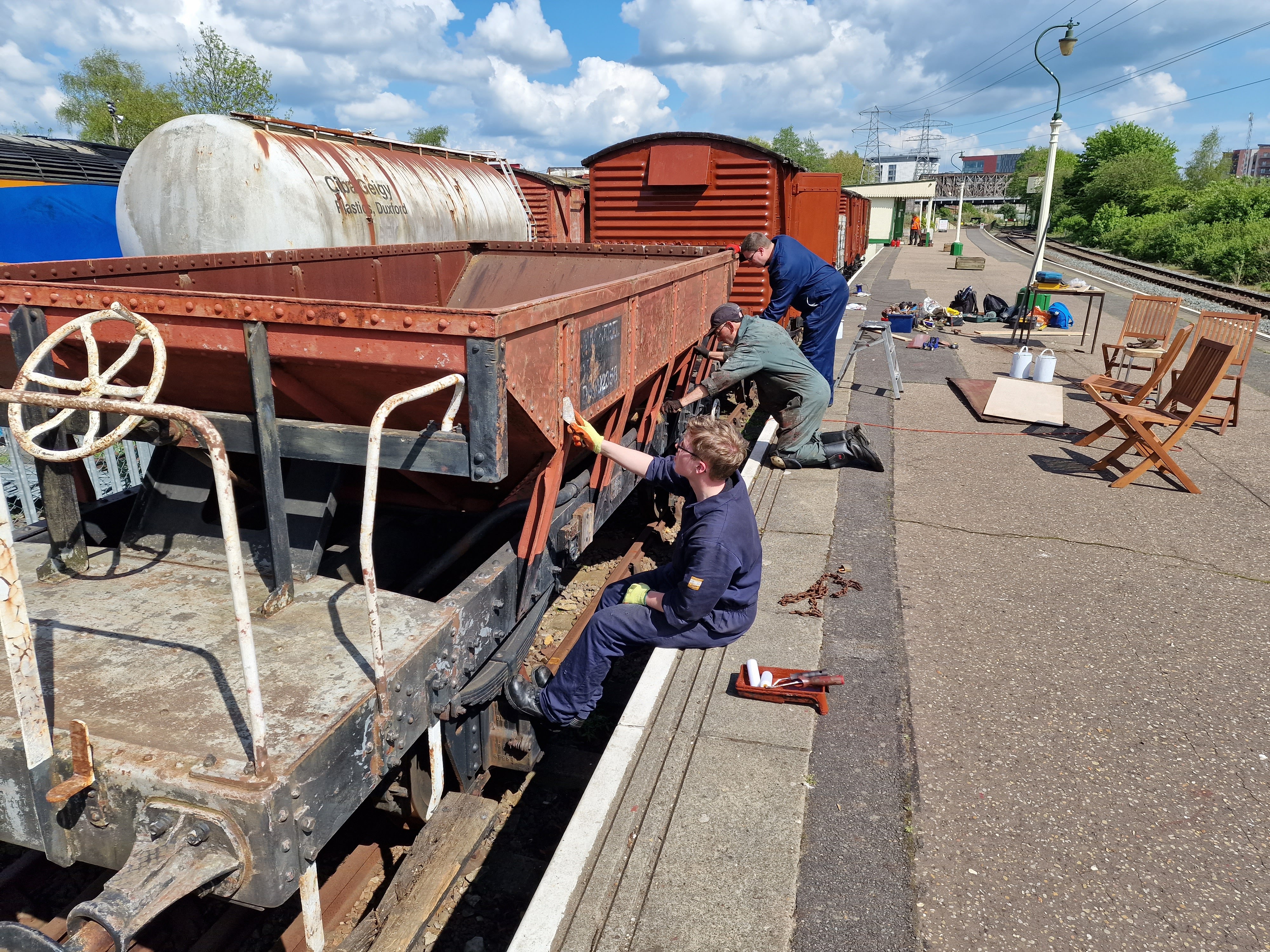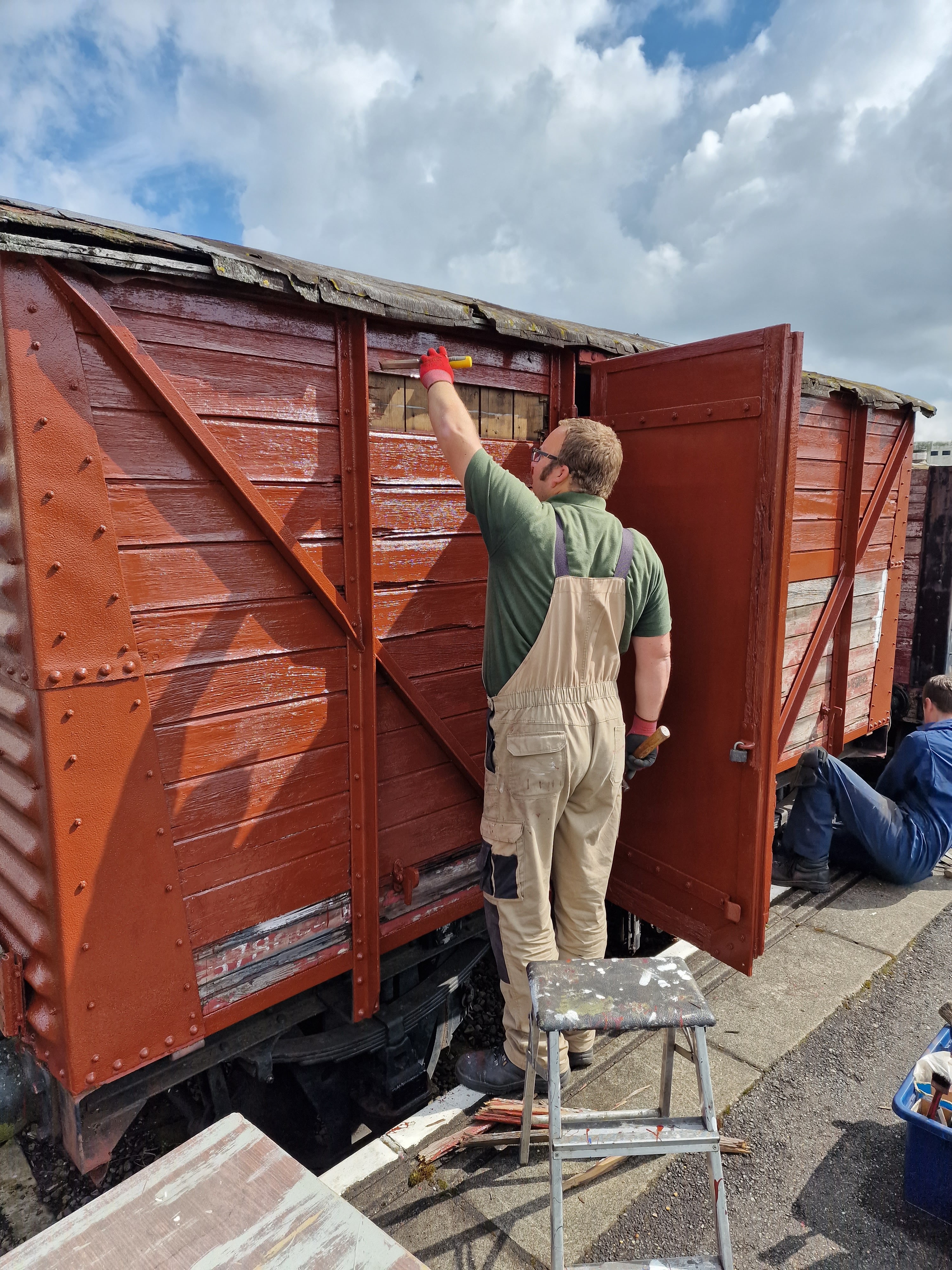 The main push for the day was on DB992358 this has carried an inaccurate Bauxite livery for quite some time, so Phil, Alan and Mark with wire brushes and scrappers in hand made a start preparing the vehicle for paint.