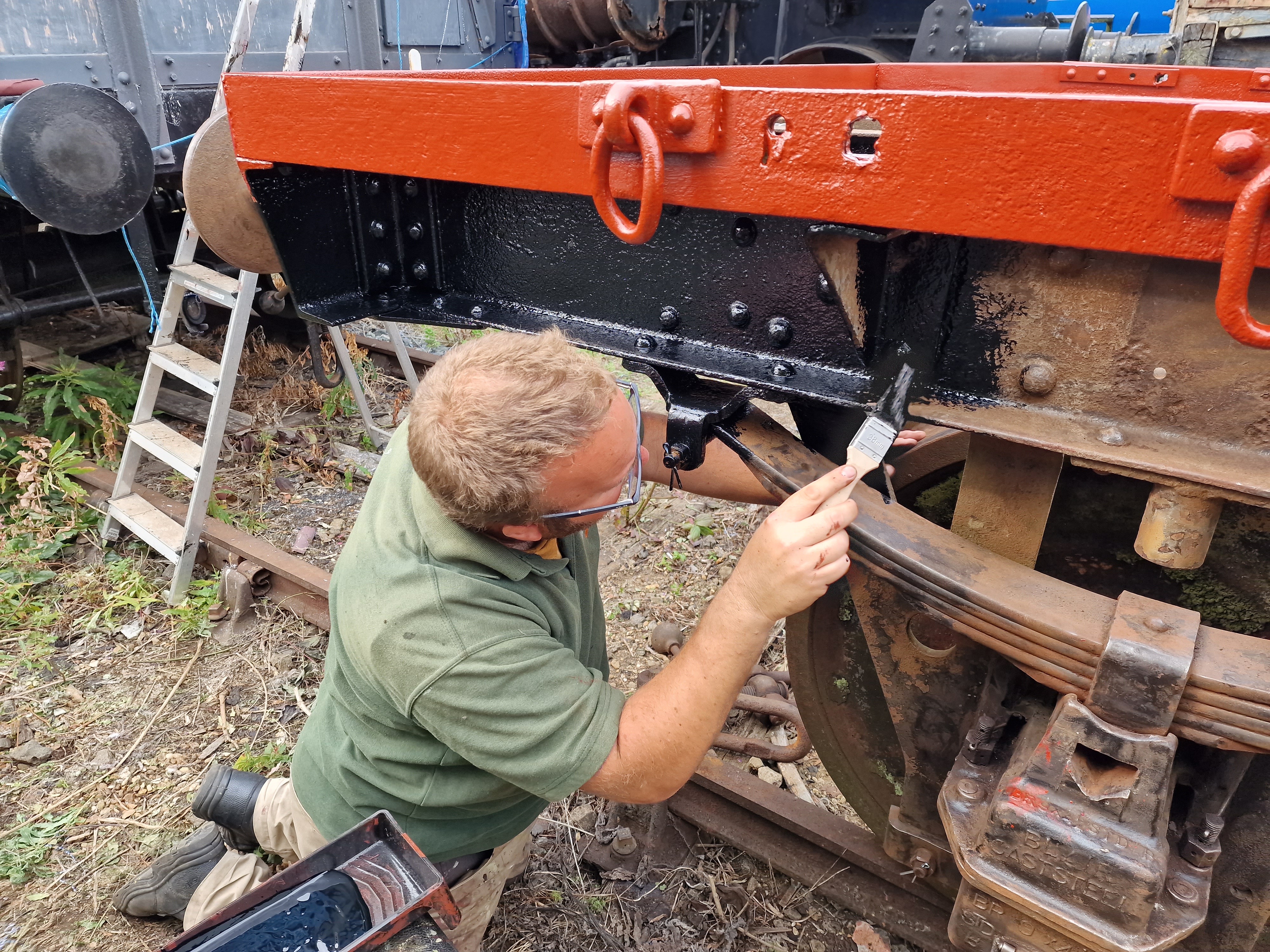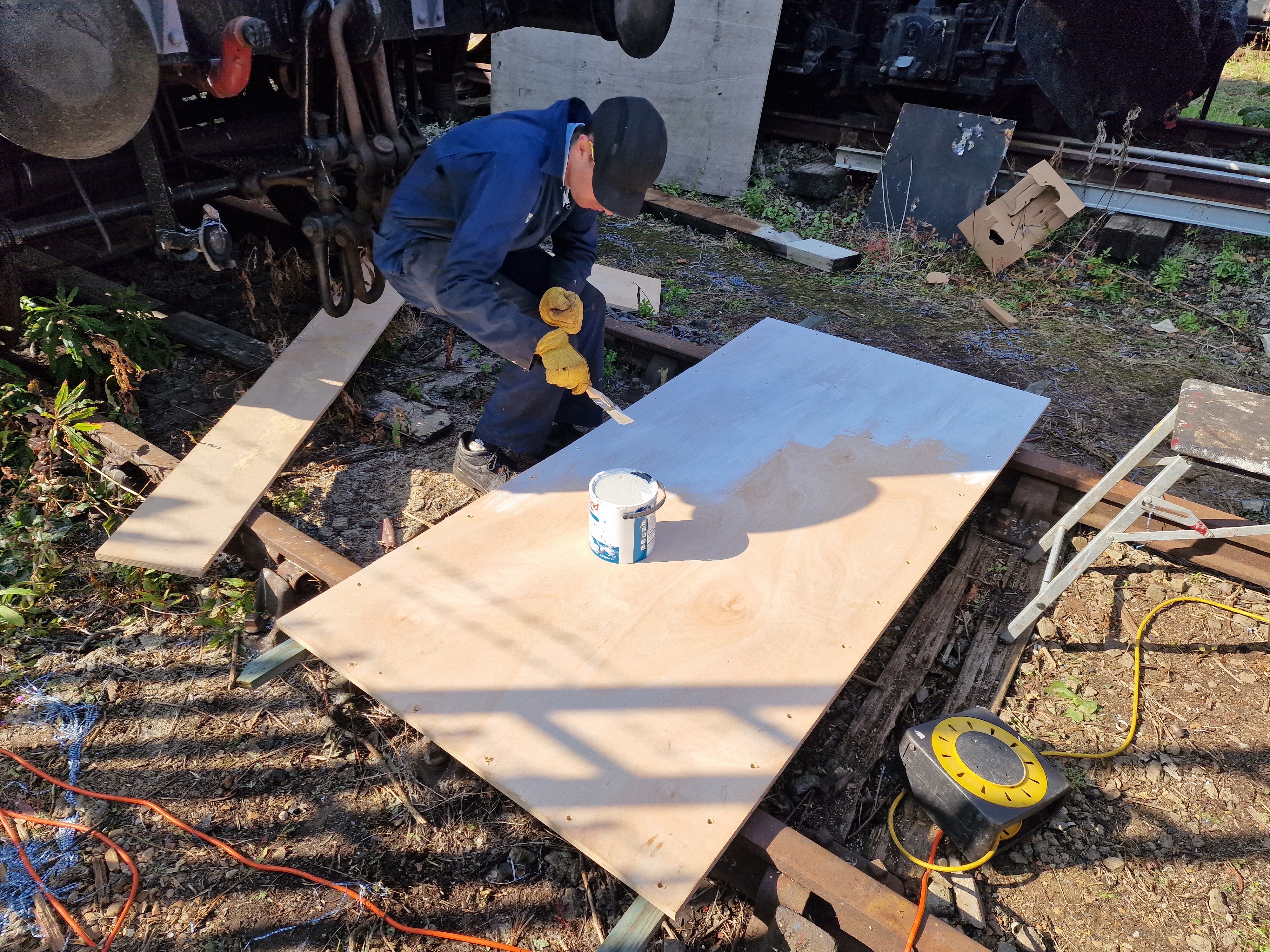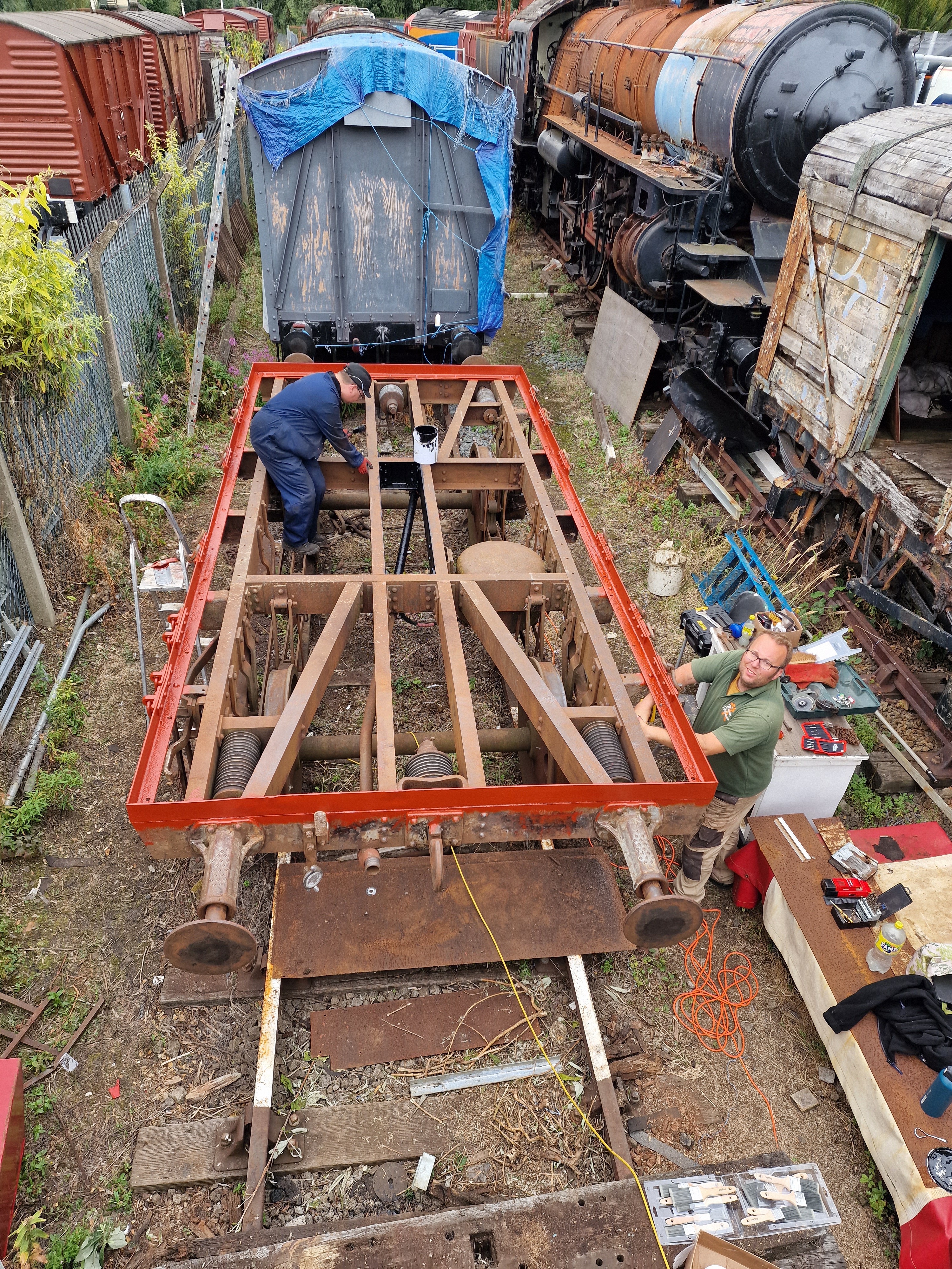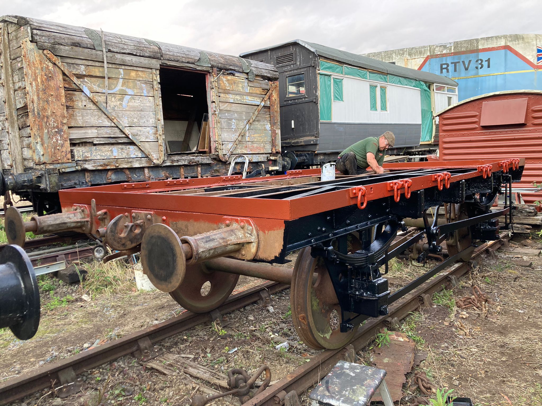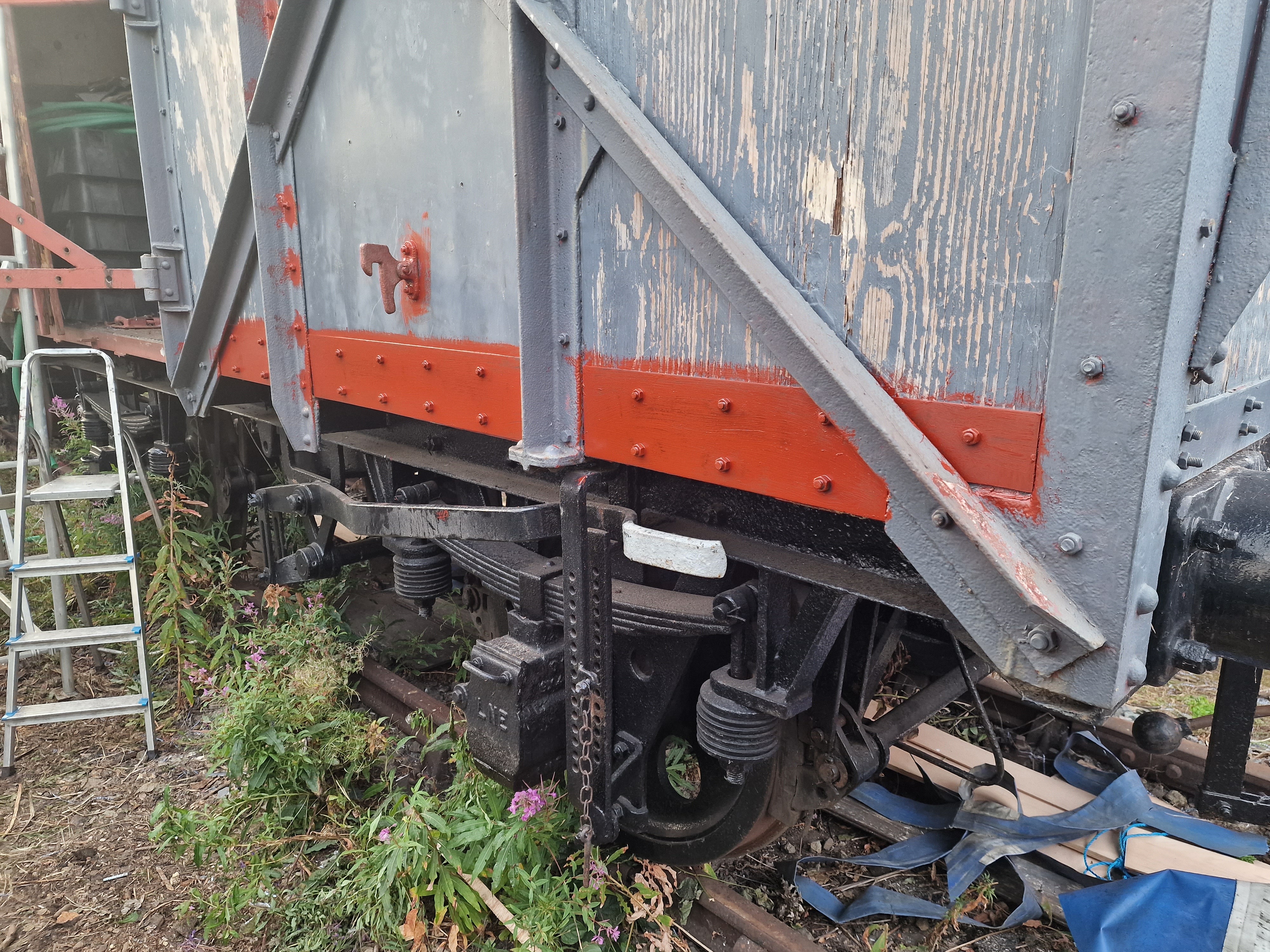 Then it was on to some painting. Tim and Mark applying underframe black to the……………….underframe, with Matt first applying red oxide primer, followed by Bauxite. Unfortunately it was not possible to complete the painting as the heavens opened.
