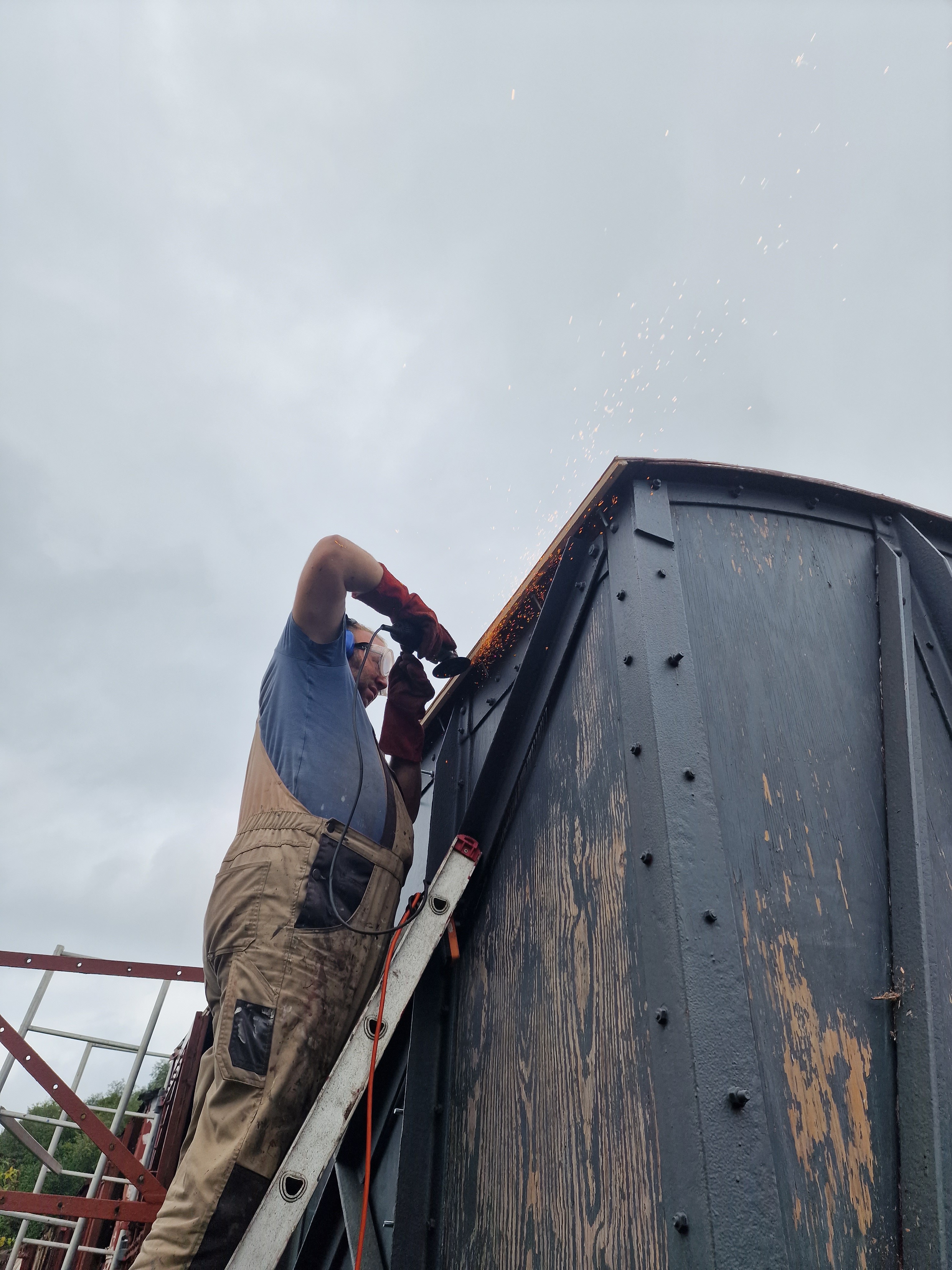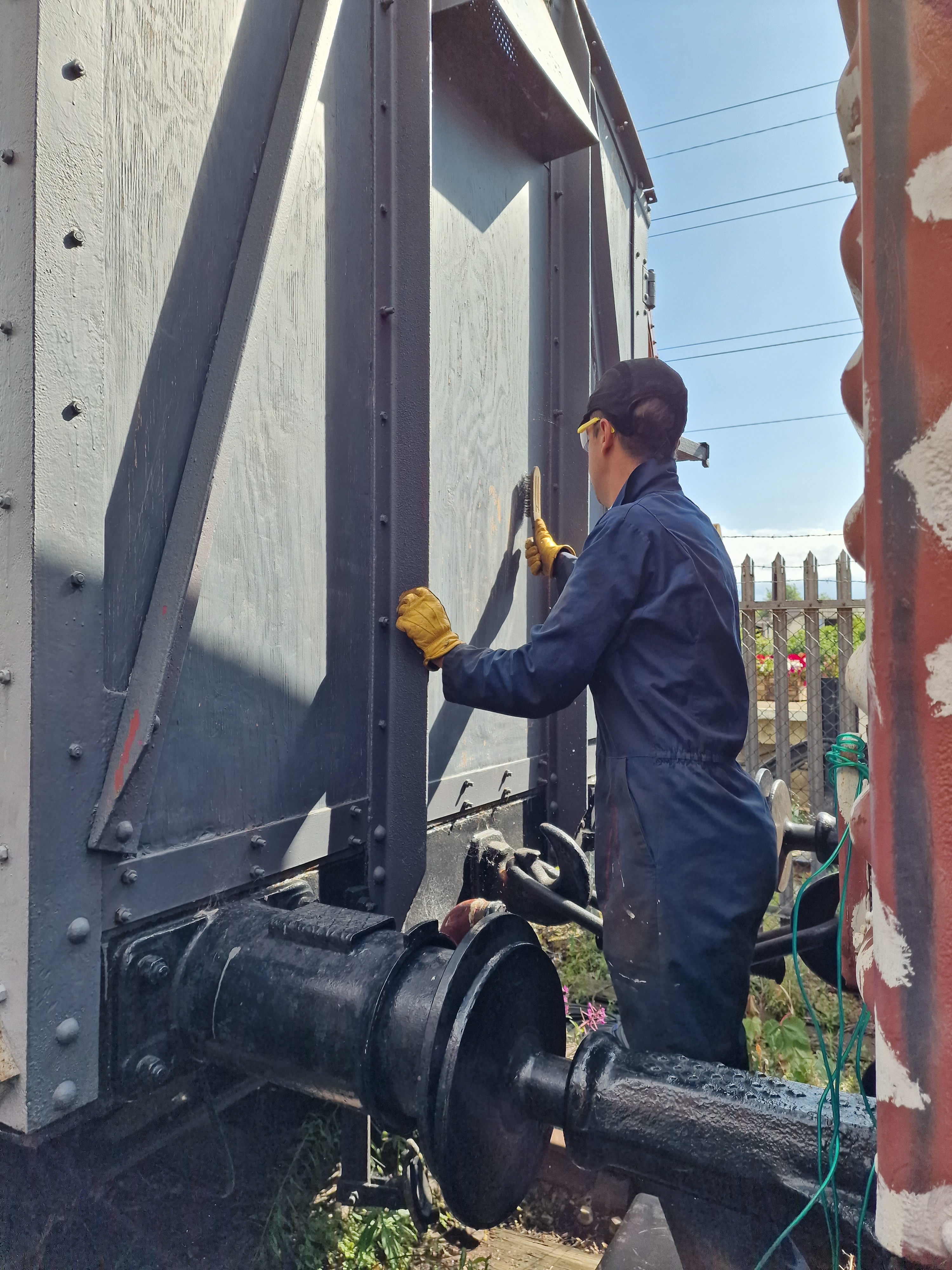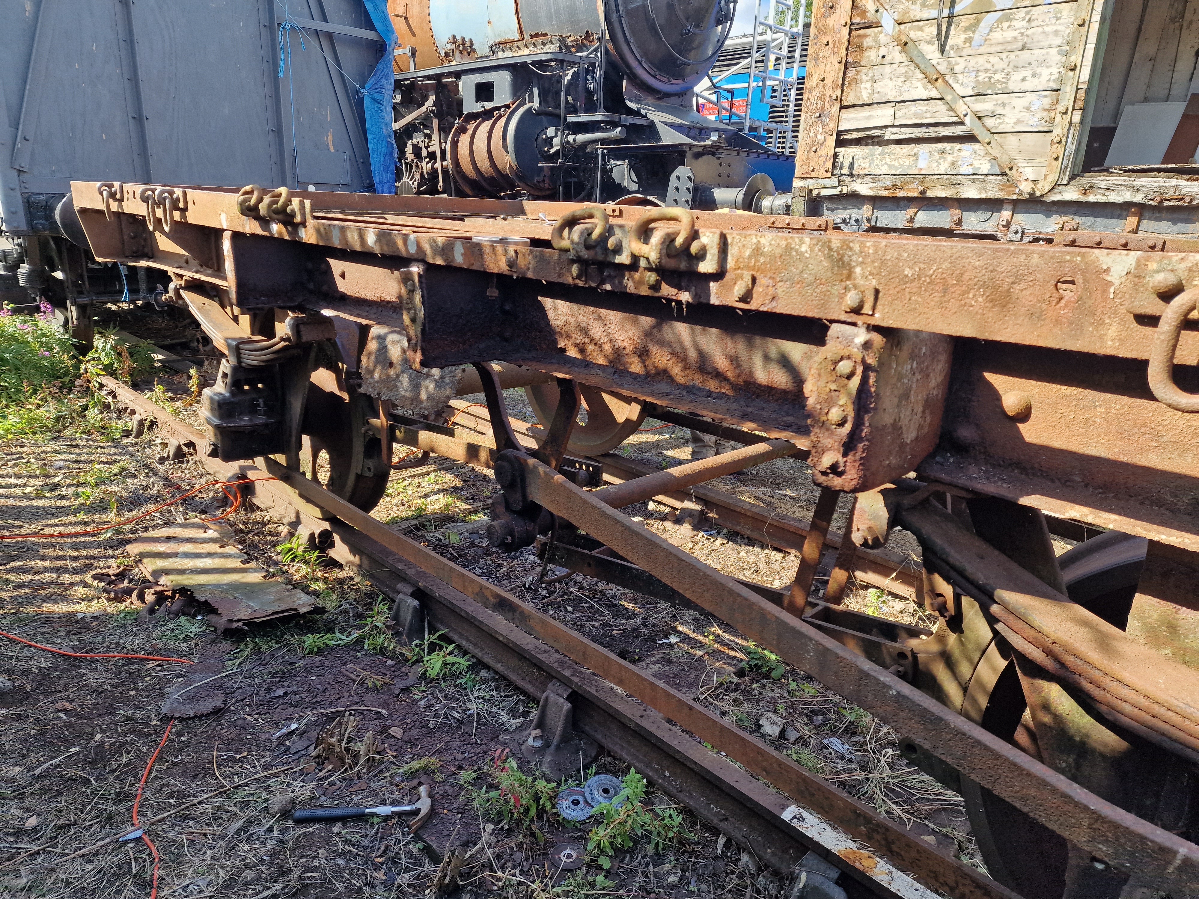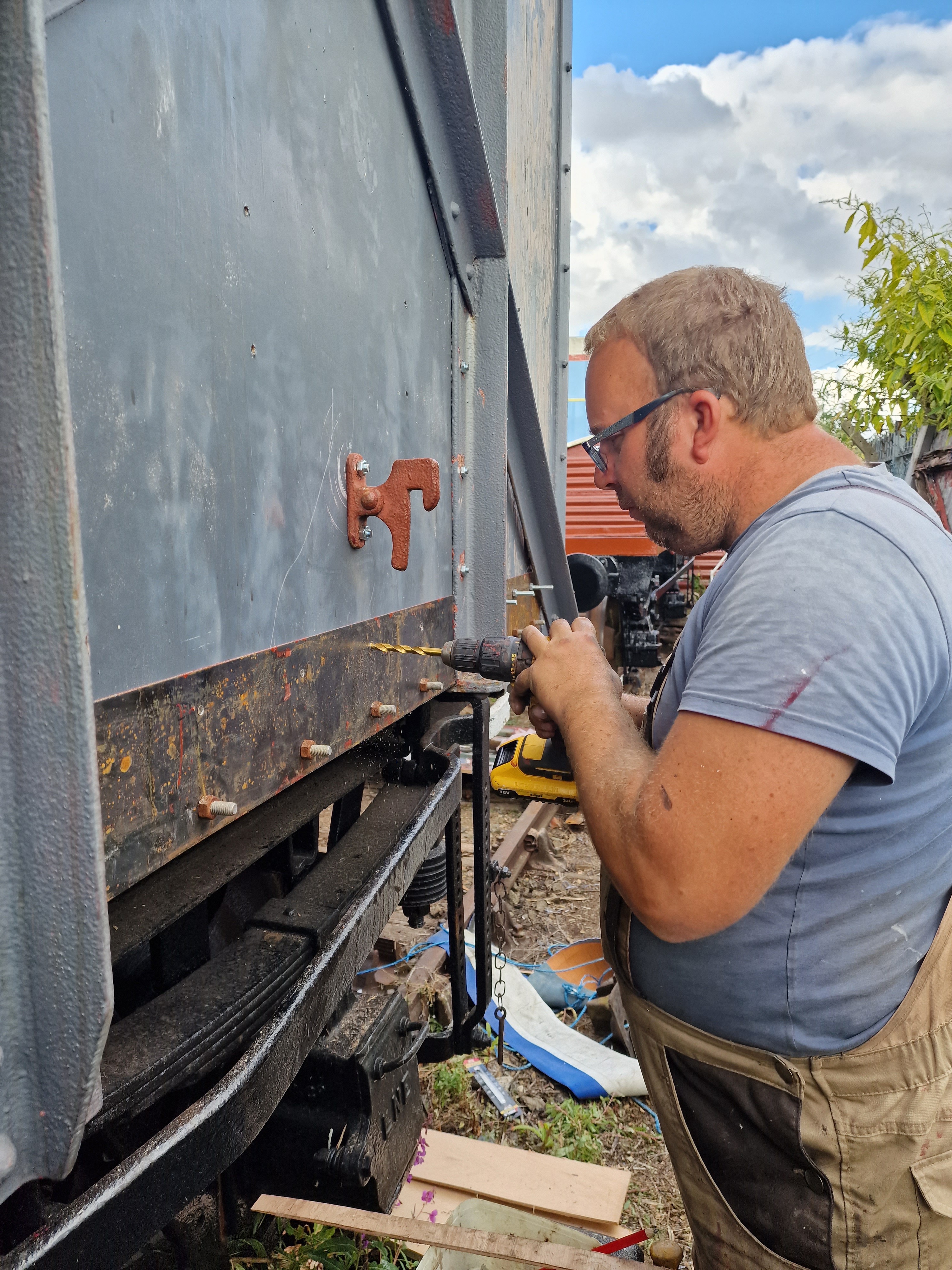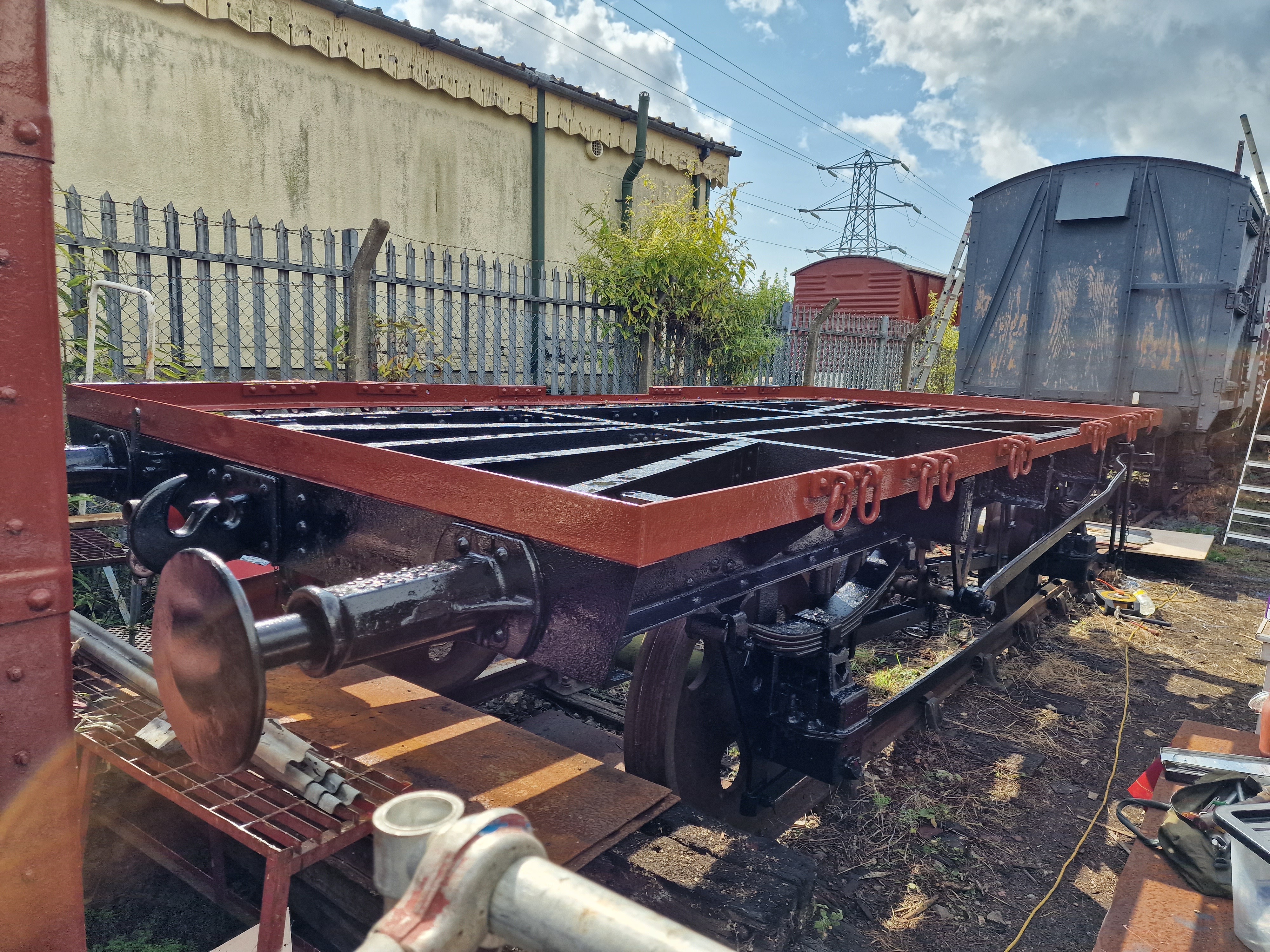 Then it was on to some painting. Tim and Mark applying underframe black to the……………….underframe, with Matt first applying red oxide primer, followed by Bauxite. Unfortunately it was not possible to complete the painting as the heavens opened.