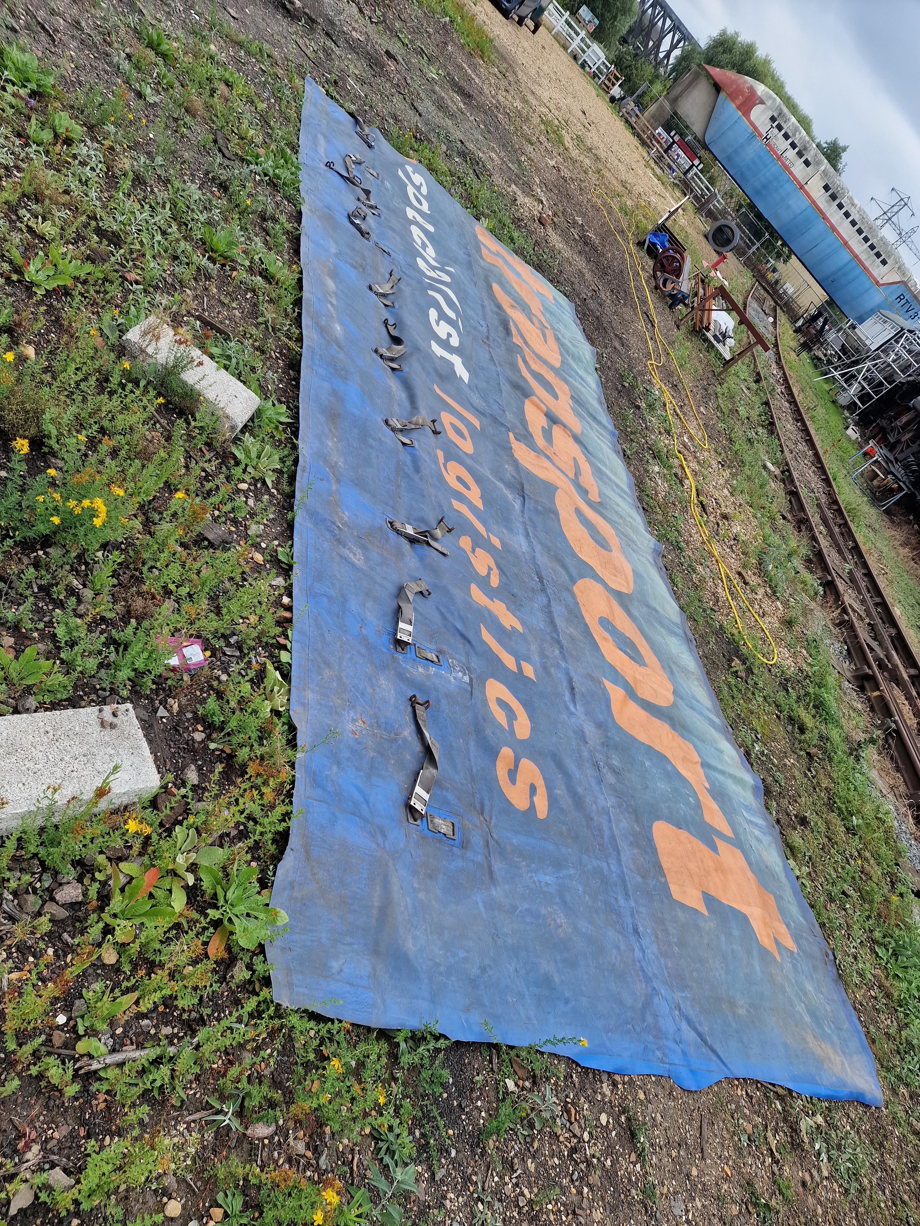A suitable lorry side curtain was selected from stores and the furniture and strapping removed.