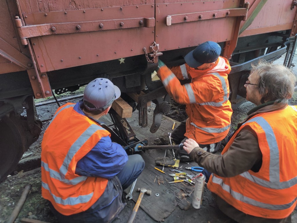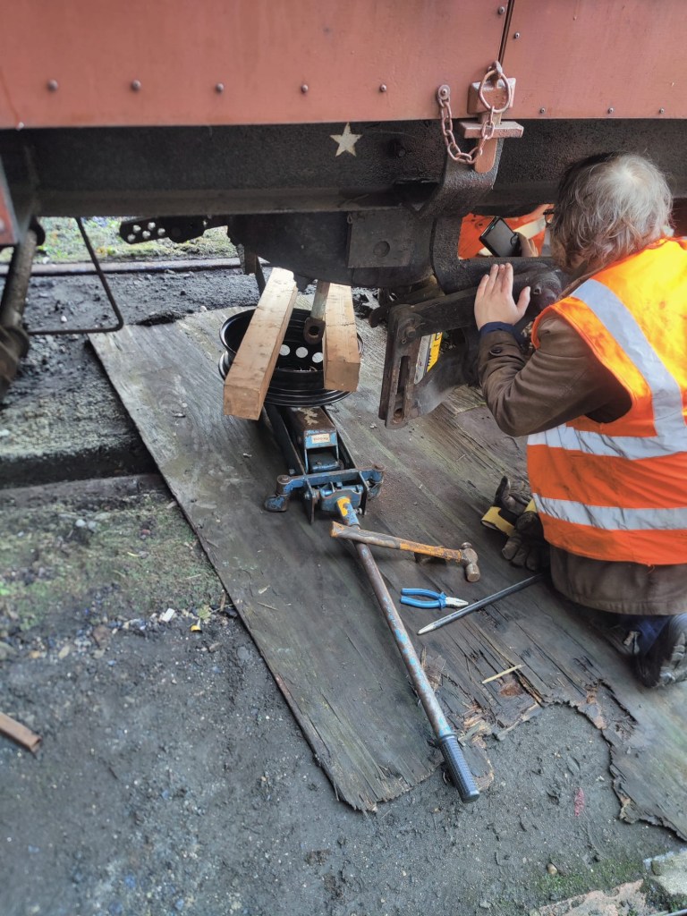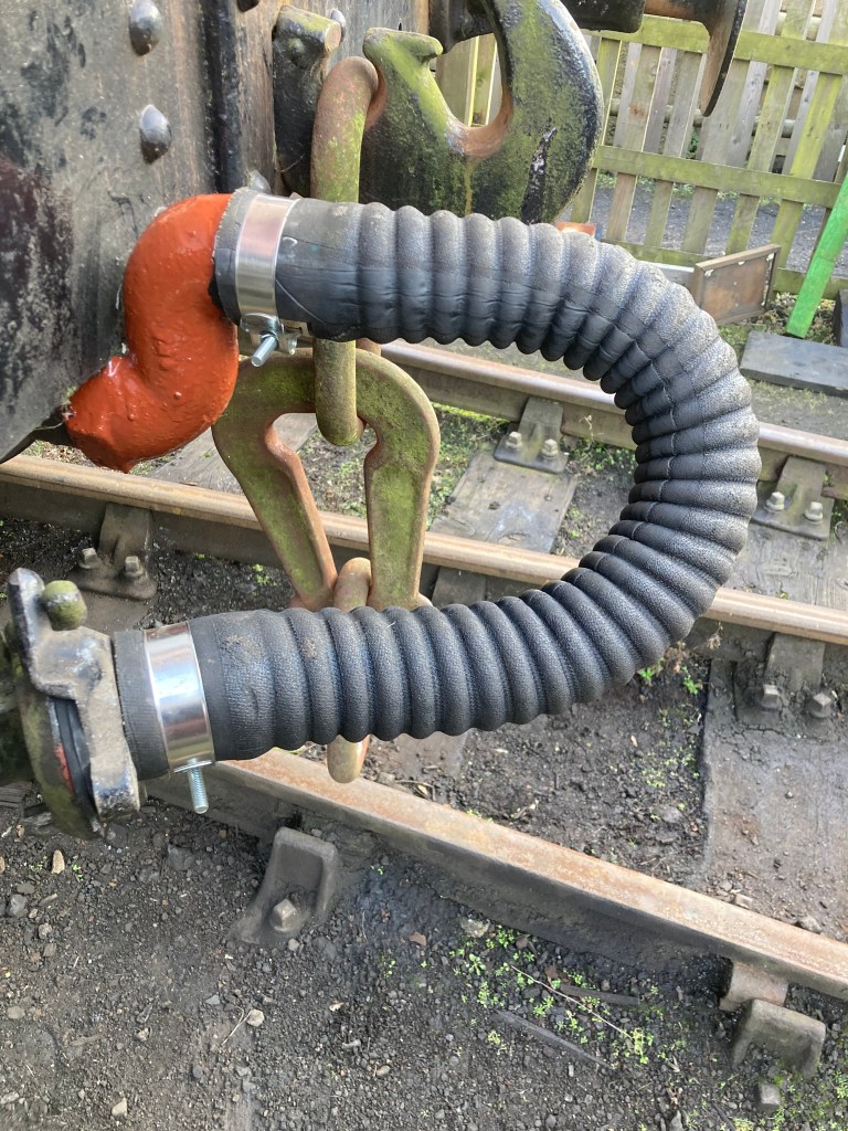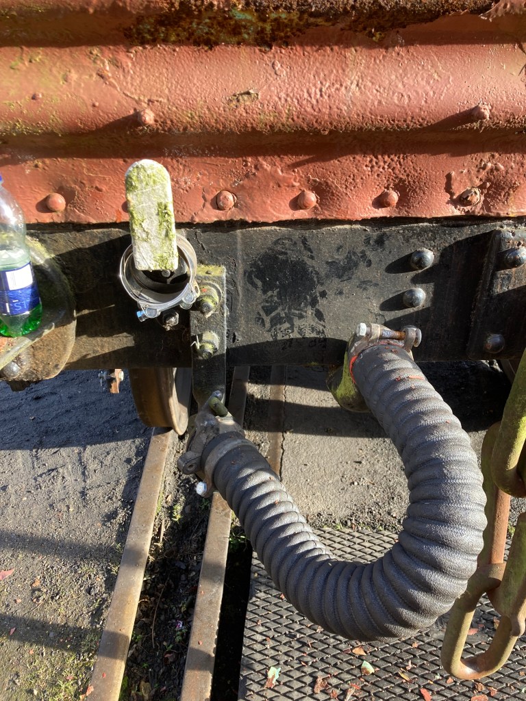 Whilst Paul, Gareth, Chris, and Mark were busy with B785409, Tim was round the corner playing with vacuum pipes. B768248 was hand shunted free from the other wagons and moved up to a flat piece of ground to have a new cylinder fitted. Tim then took the opportunity to get at both ends of the wagon to fit new rubber washers to the vacuum hoses and smarten up the swan necks with some paint.