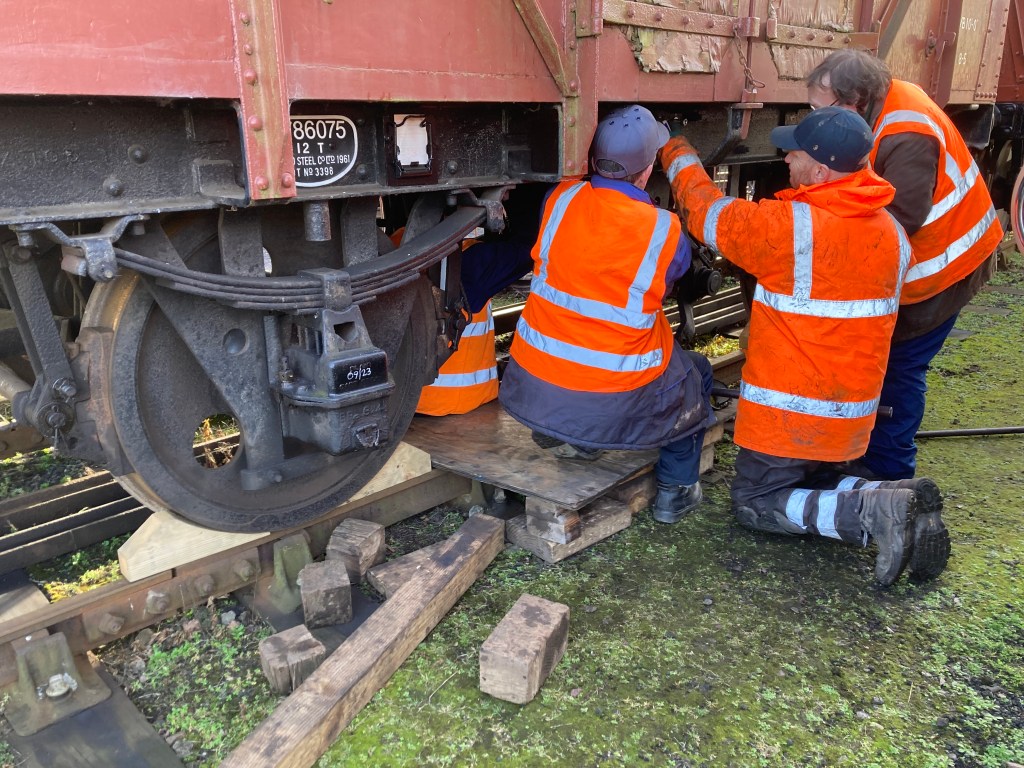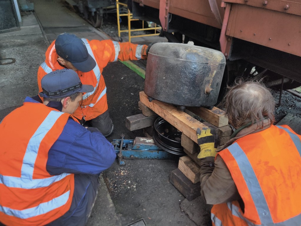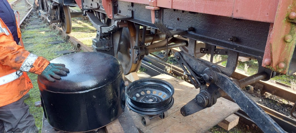 An hour later a cylinder was firmly in place under B786075, with final fitting of the valve, branch pipe, and release cord to be completed in the coming week. As with all the vehicles being worked on the brakes were released to get the cylinder in, so plenty of chocks were used for maximum safety.