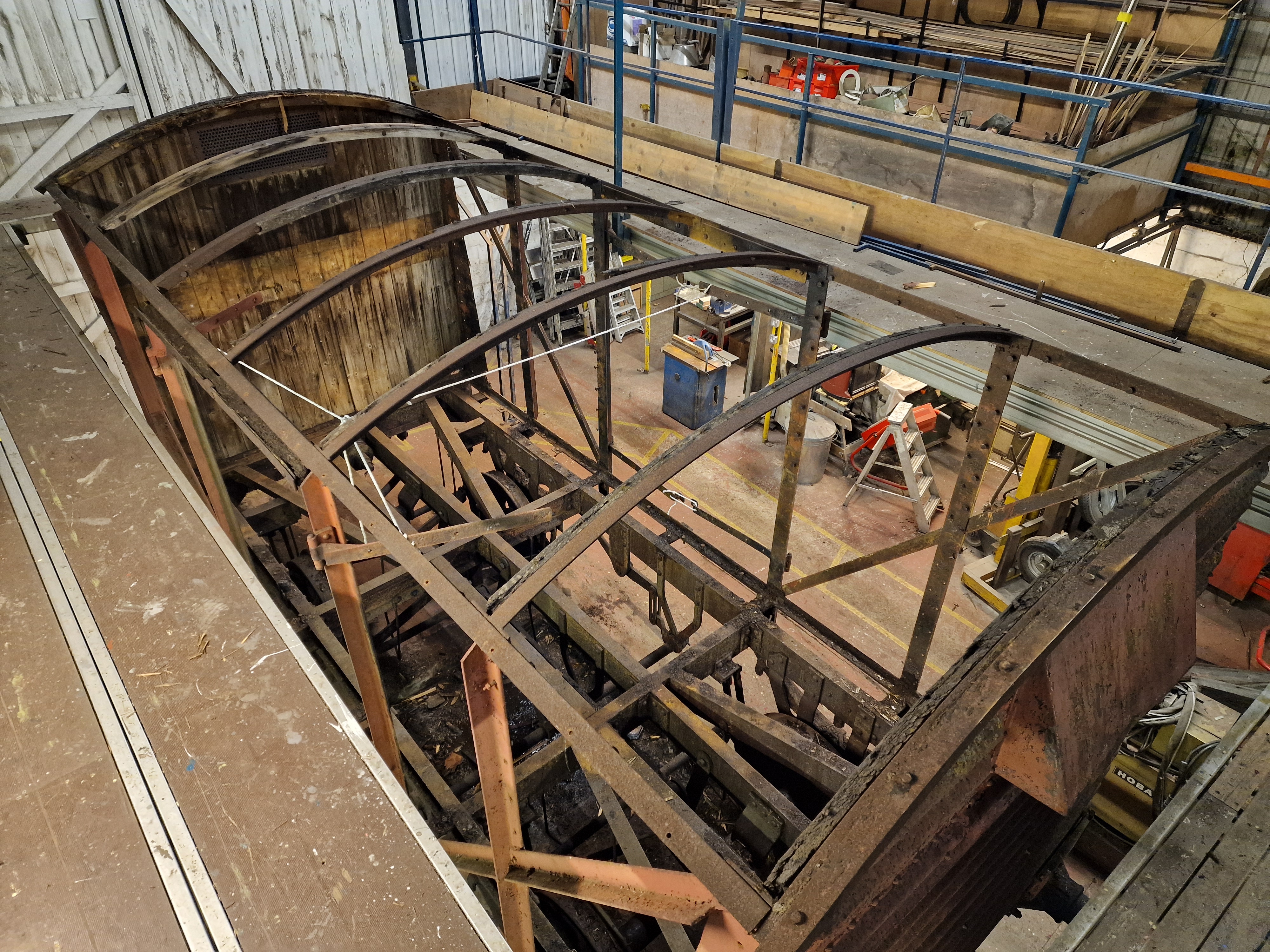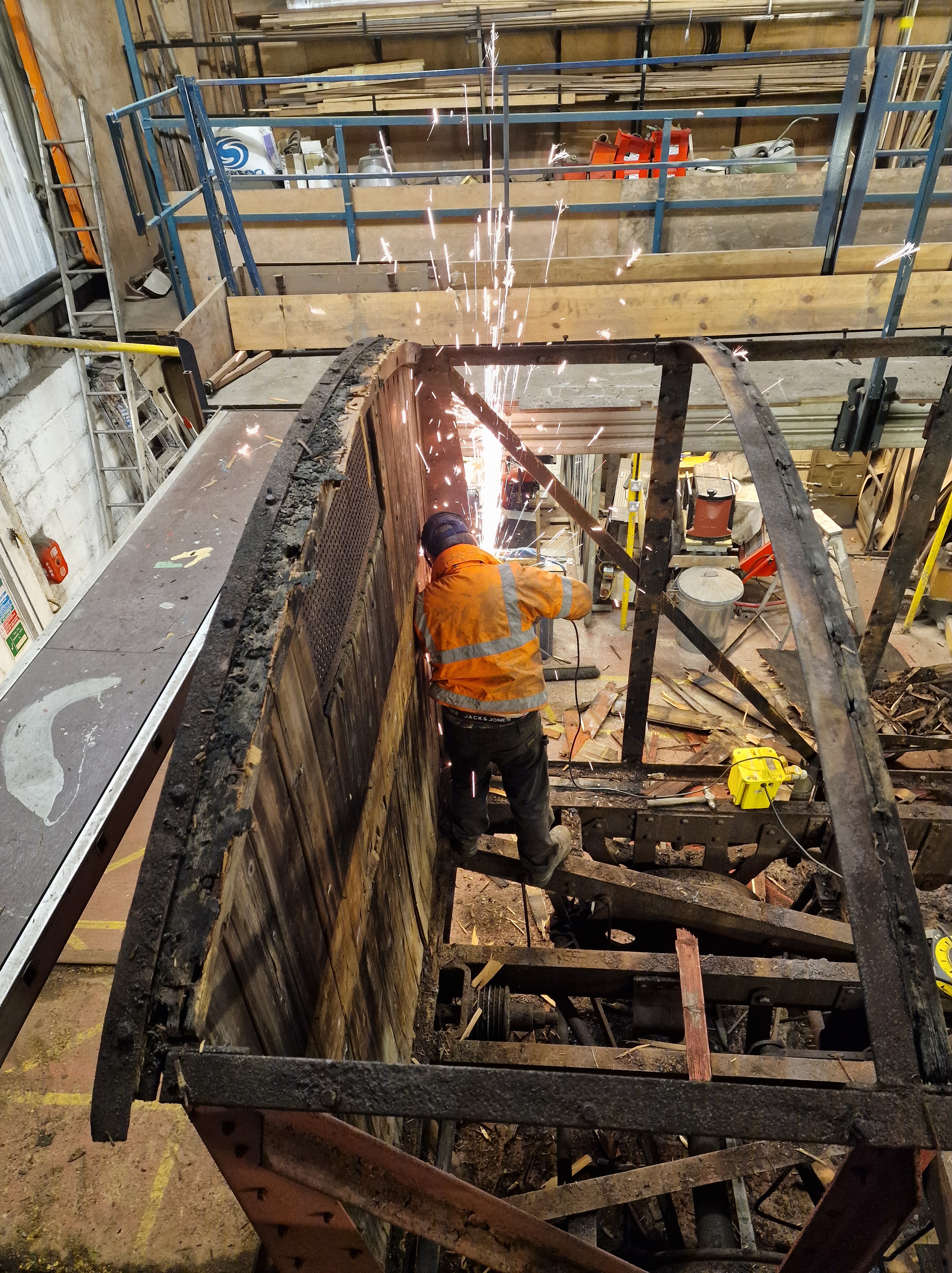 Steve, armed with a grinder started removing the roof hoops and noggin retainers from B774874.