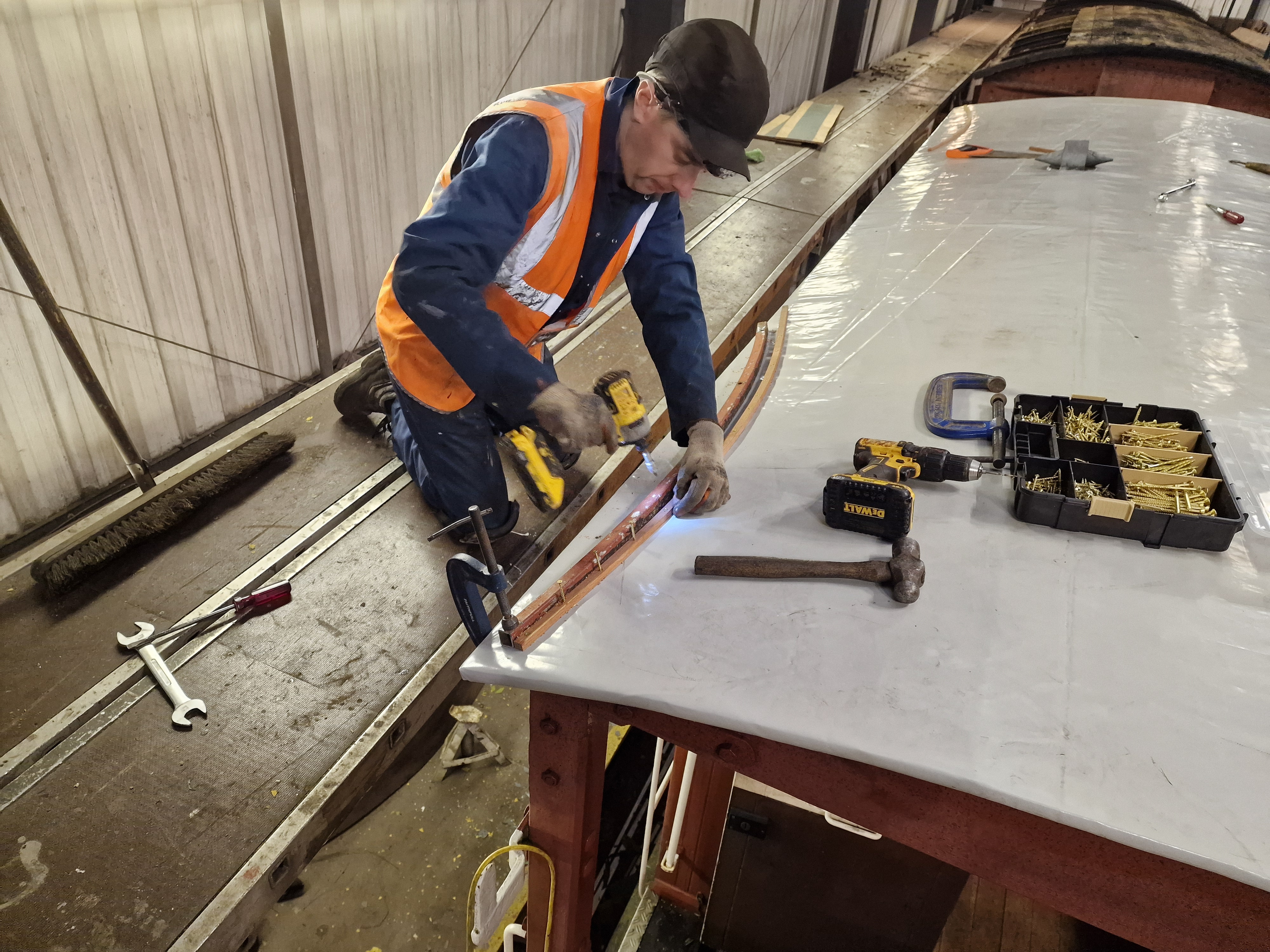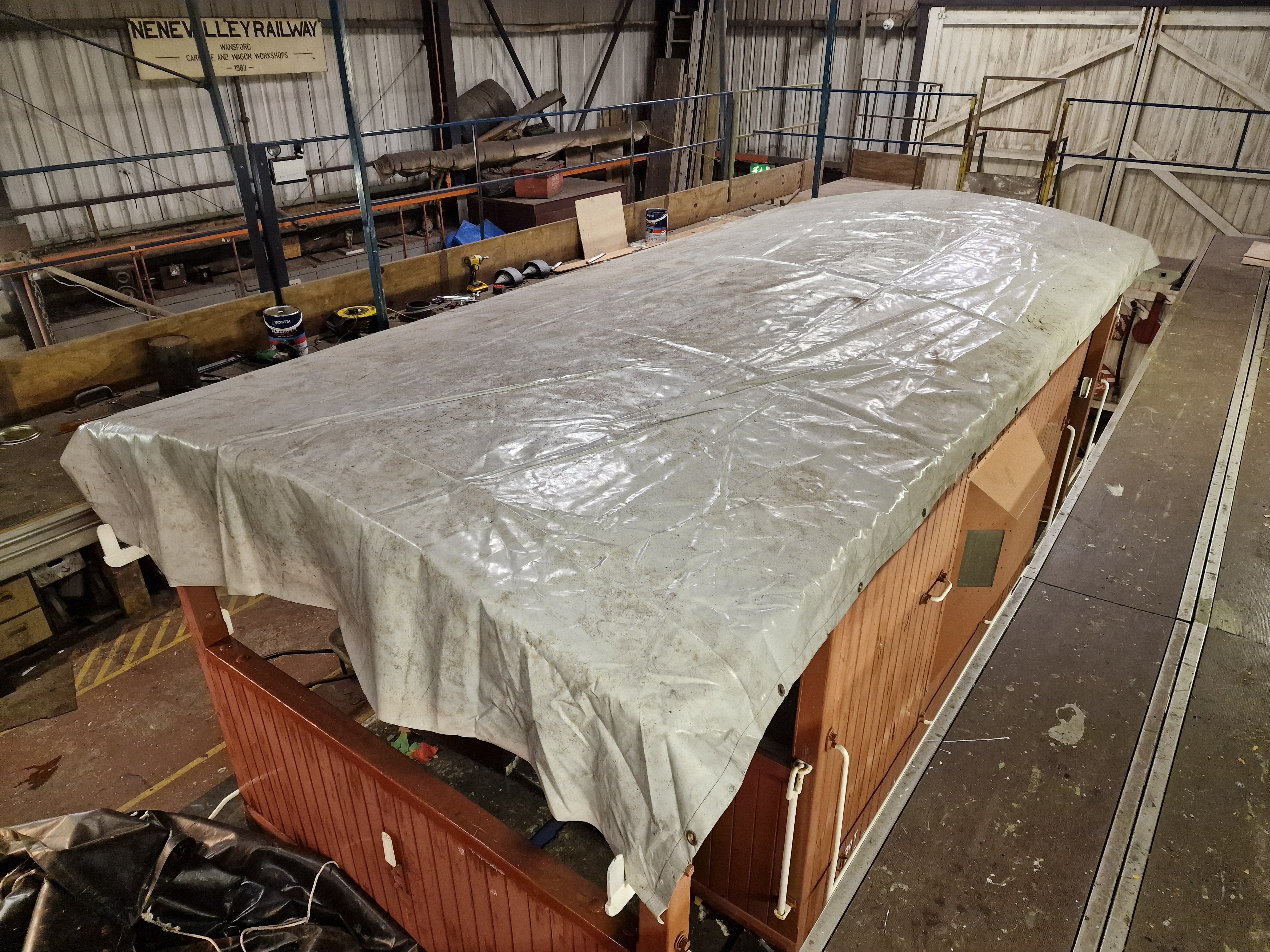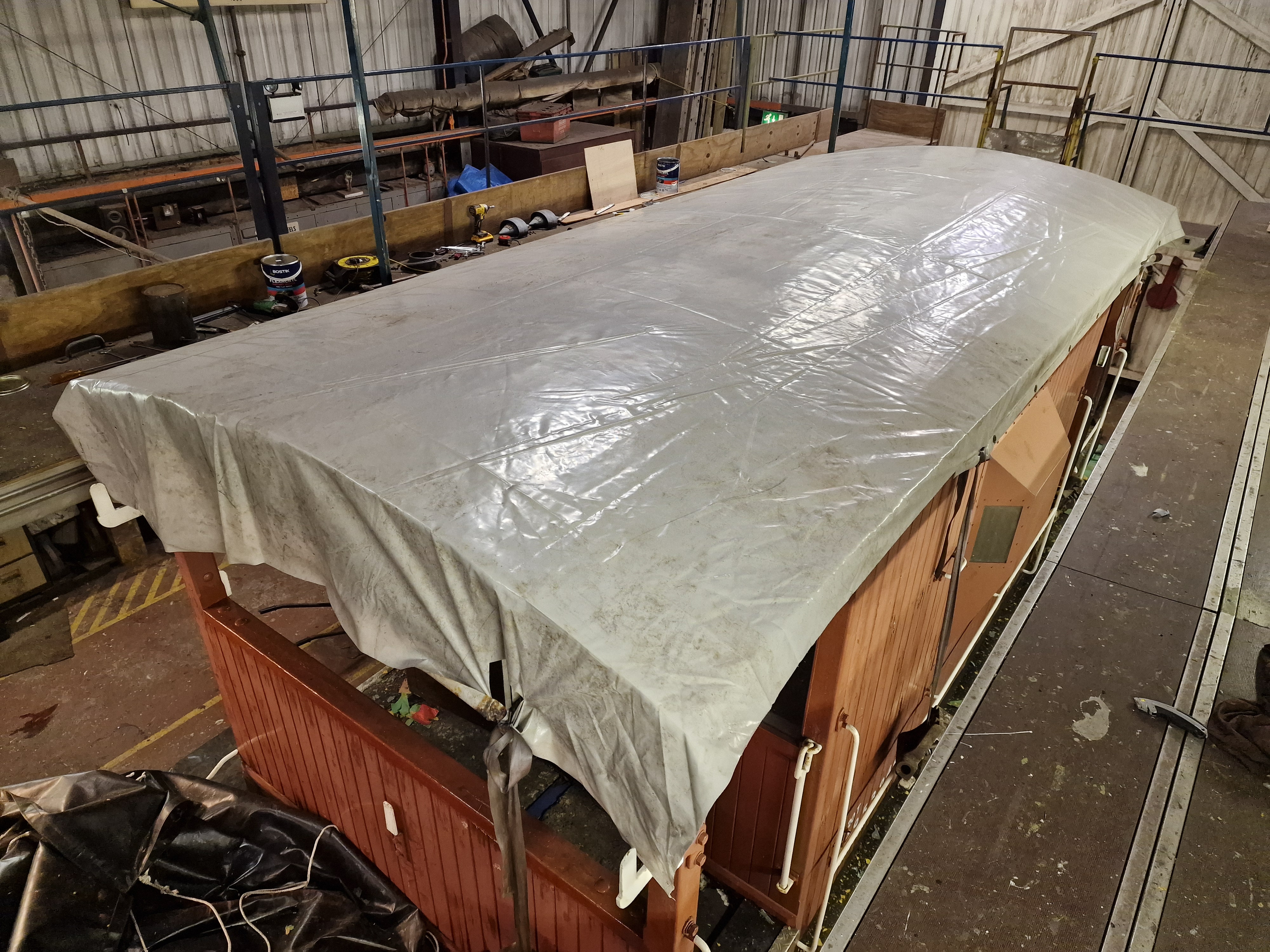 The 21st saw Jason and I on site continuing with the Brakevan. Stapling the rest of the sheet down after an additional day to stretch. Once again, like the Southern brake and what seems counterintuitive, holes were cut into the sheet for the chimney and vents.