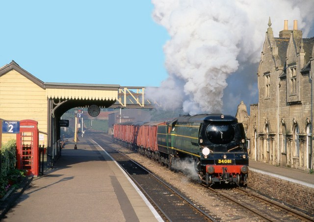 21st June 1998: 34081 “92 Squadron”, in Southern/British Railways transition livery, charges through Wansford station with the van train. “92 Squadron” is resident on the railway once again after some time away, and is undergoing rapid major overhaul. With your support, it is possible this scene could be recreated in a few years time. Image courtesy of Ian Bowskill (C)