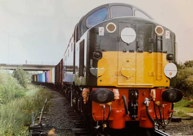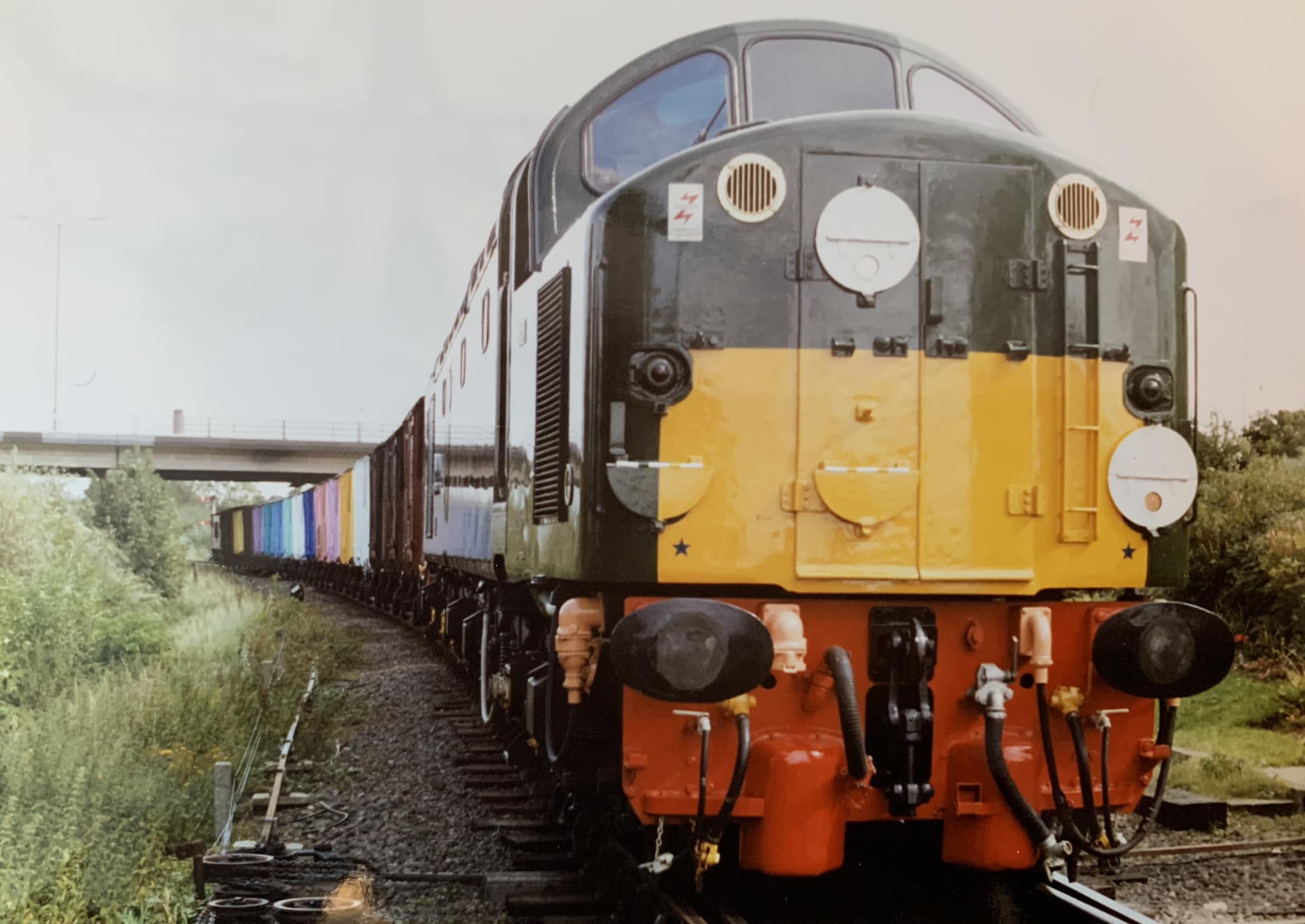 Early 1990’s: Class 40 D306 “Atlantic Conveyor”, then owned by Geral Boden, hauling the van rake of many colours some time after the making of the B&Q paint advert in 1992. Image courtesy of Keith Parkinson (C)