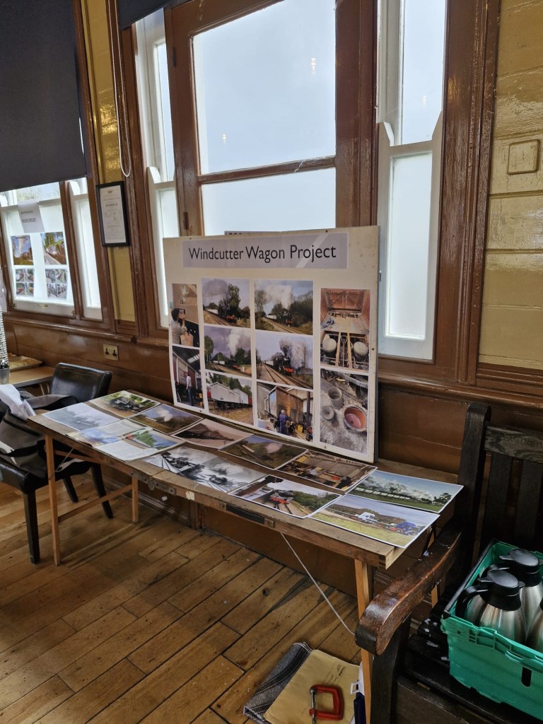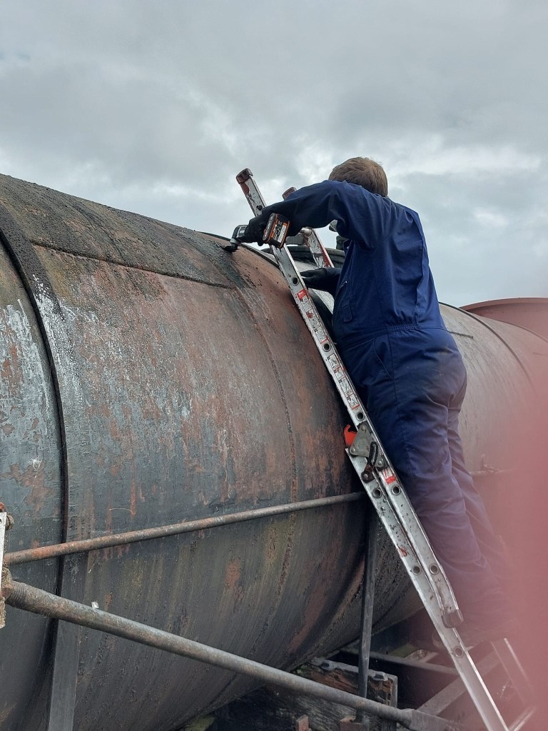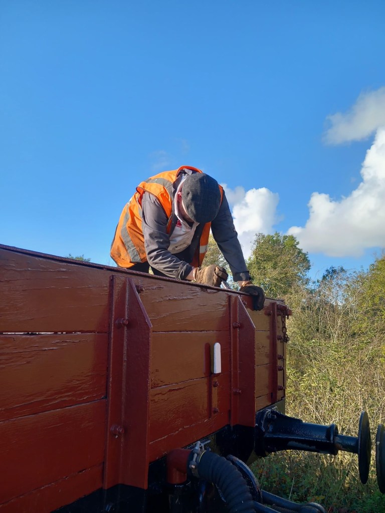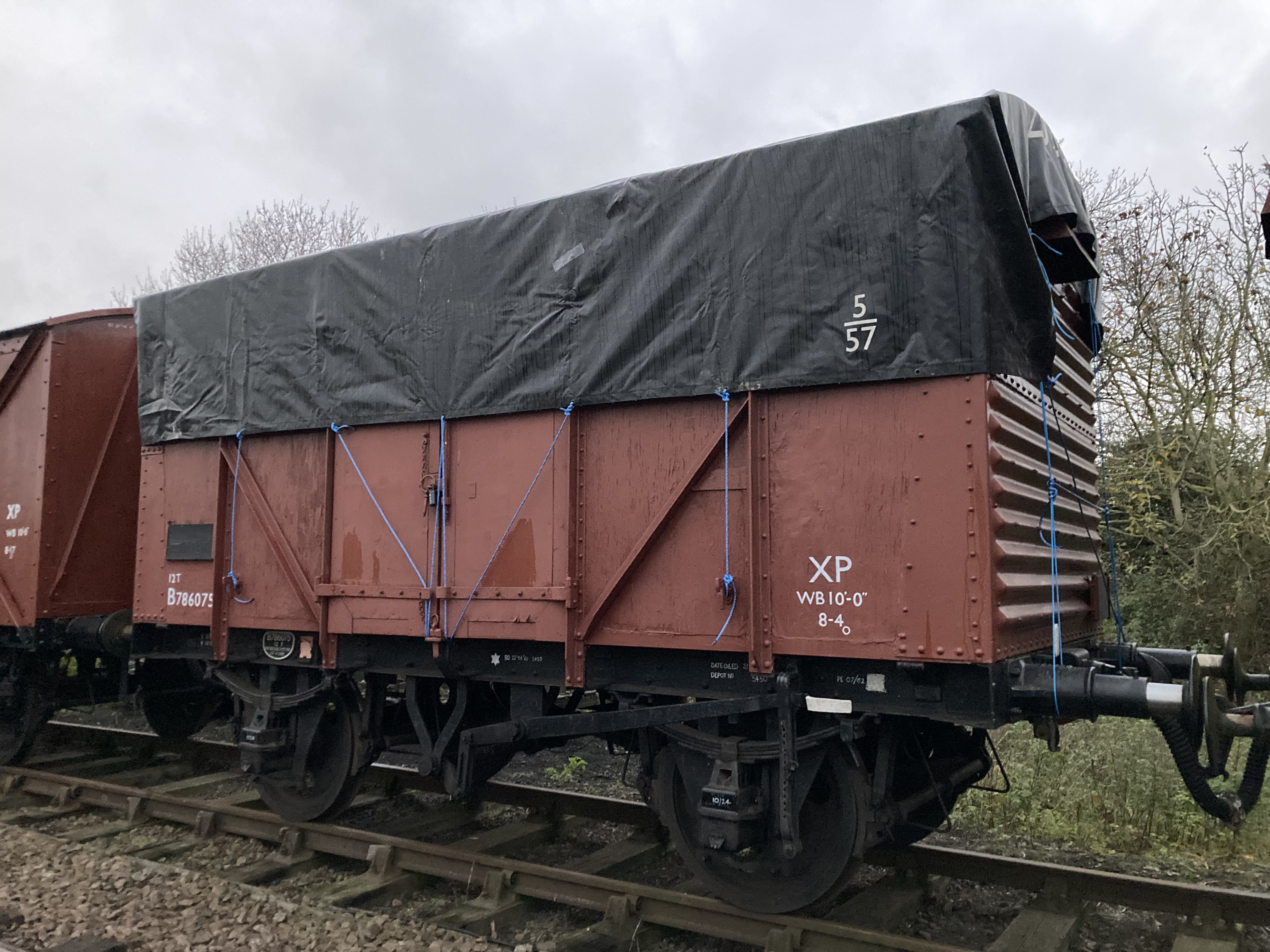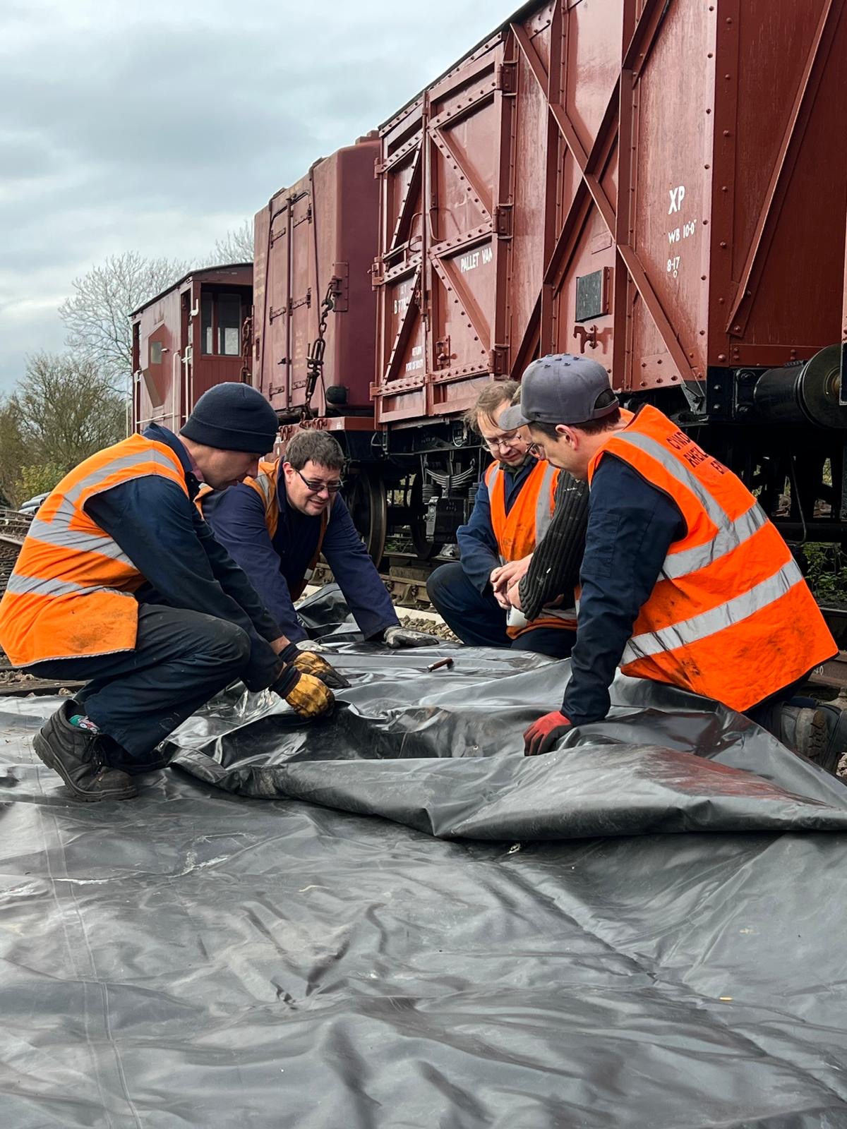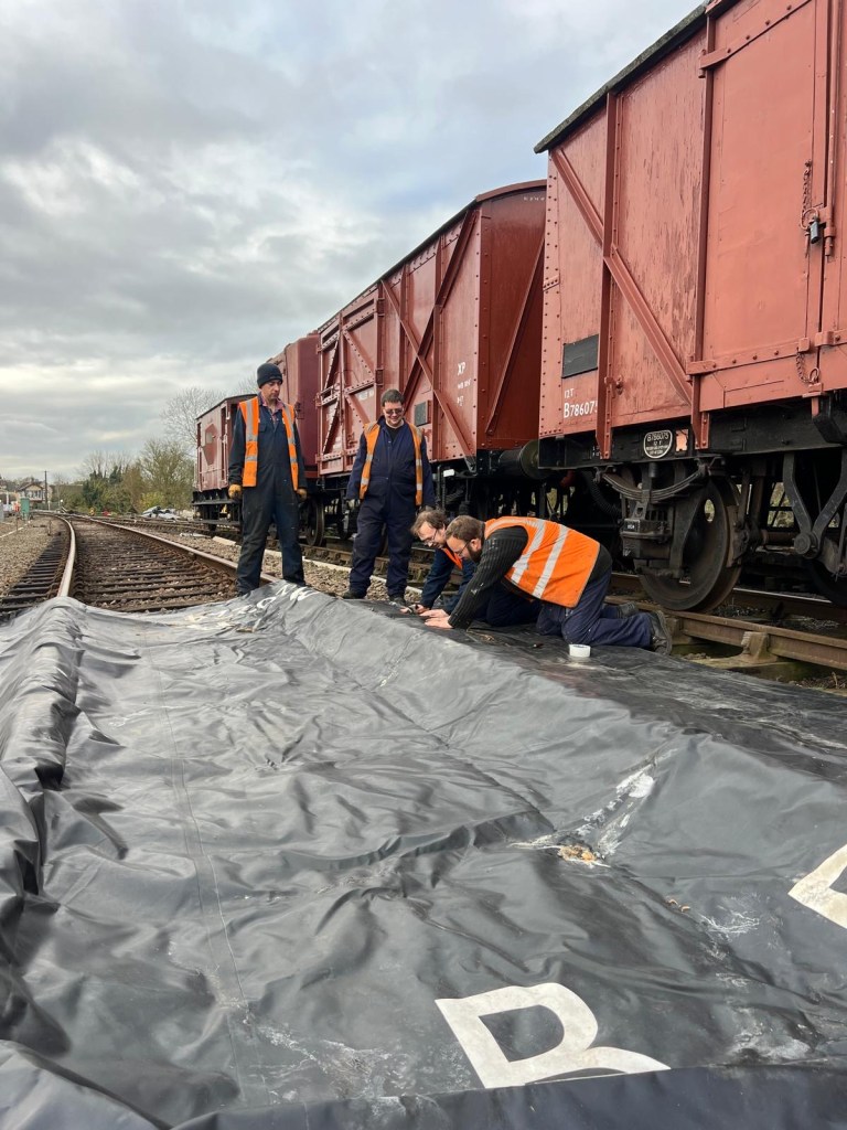 Following the defeat with the springs, Tim and Annika were joined down the siding by Colin, Paul, Steve, Gareth, Mark, and Jason, for another team effort in ticking a job off the list. BR van B786075 has suffered from a leaking roof for the past few months and during the freight running weekend Tim noticed from the footbridge some rather large cracks in the roof canvass, which has caused the roof to get wet and sag in several places. With no facilities available to replace the roof it was decided to sheet it over to get through the winter. Hopefully this will allow the interior to dry out a bit and save further damage to the floor. However, before the tarpaulin could be thrown over the roof a small repair was needed, so it was opened out for inspection. It should be noted that no trains were running on Saturday……we would never obstruct the line on a running day!