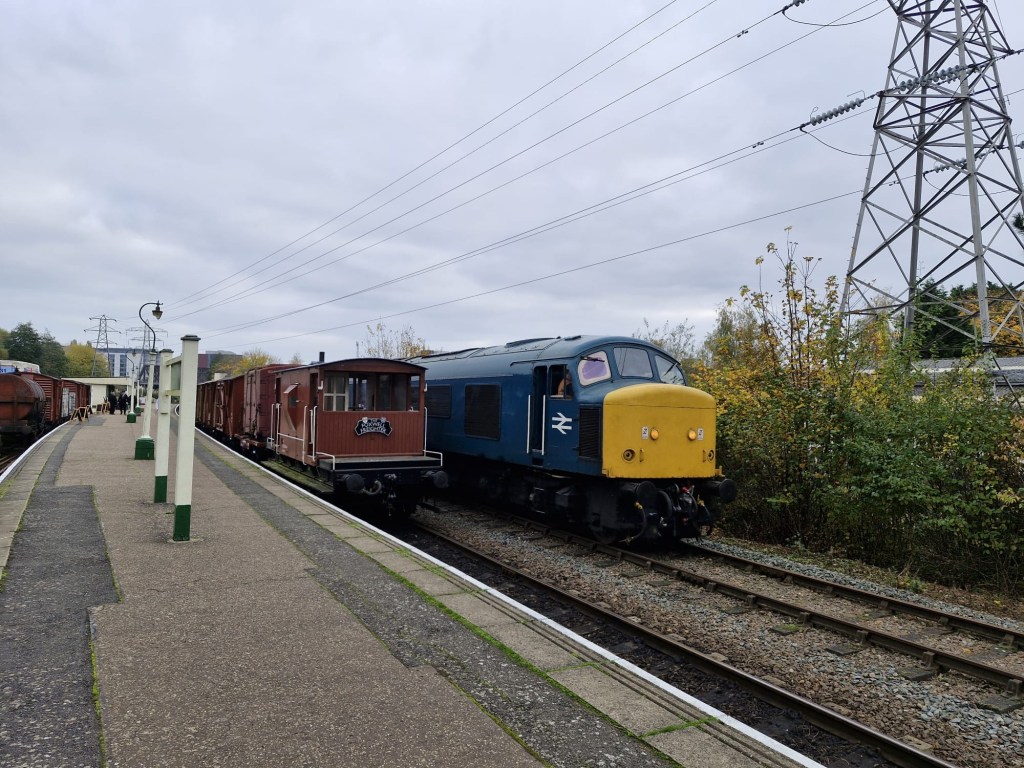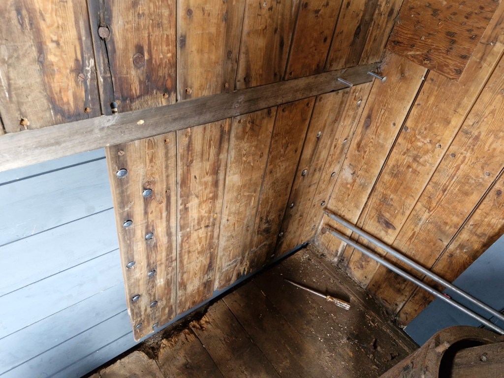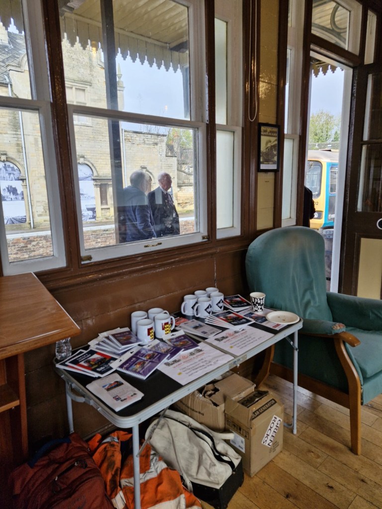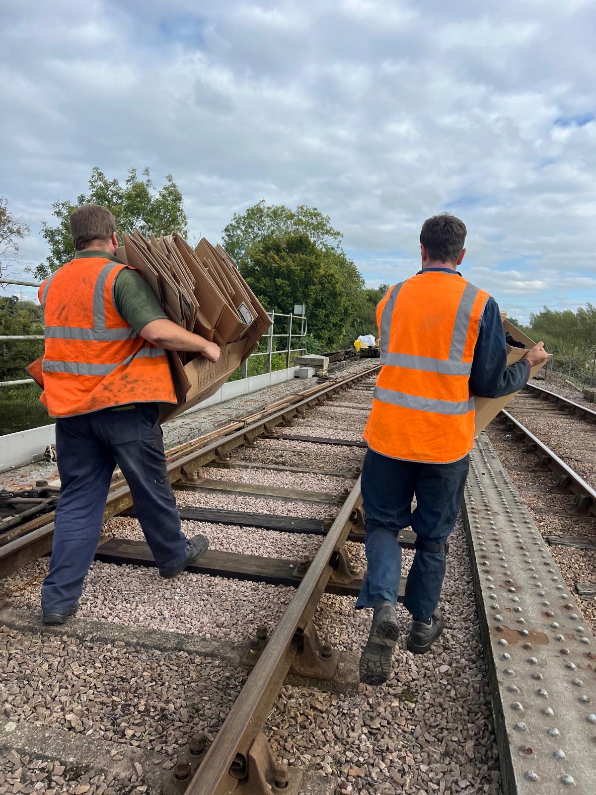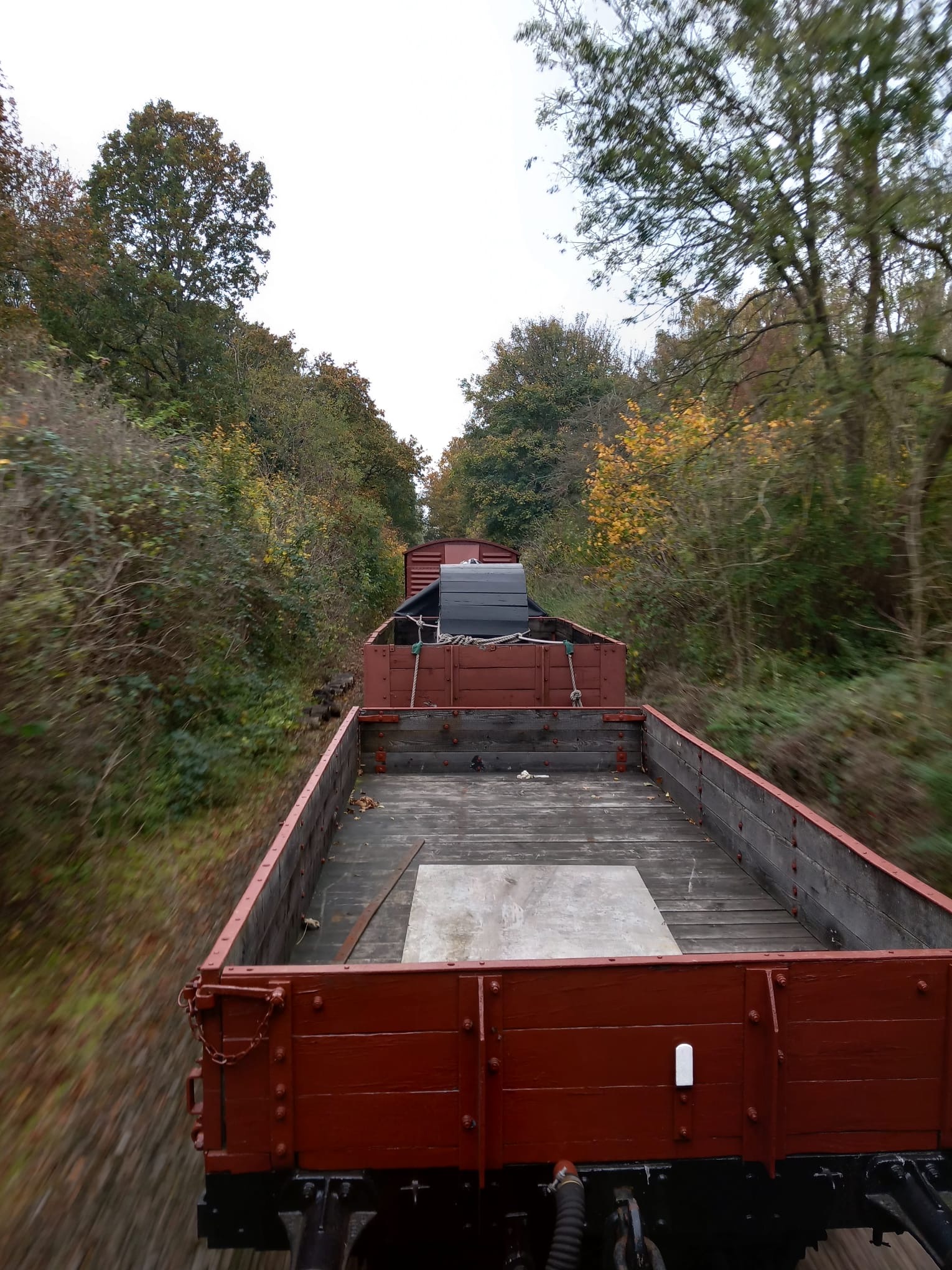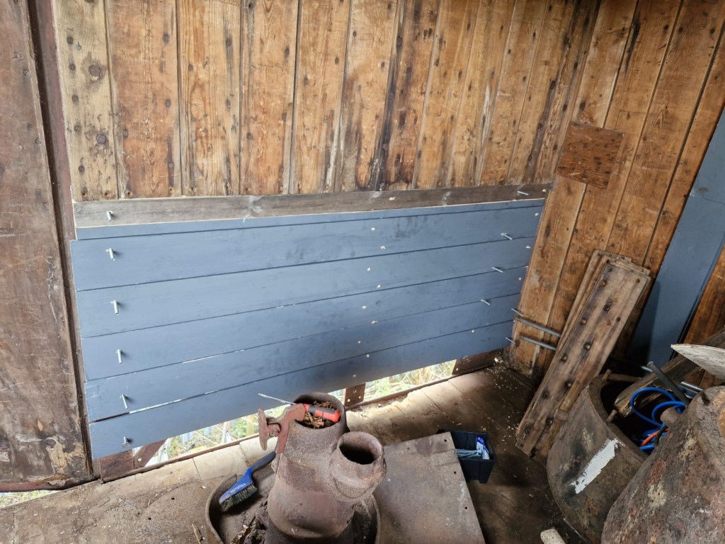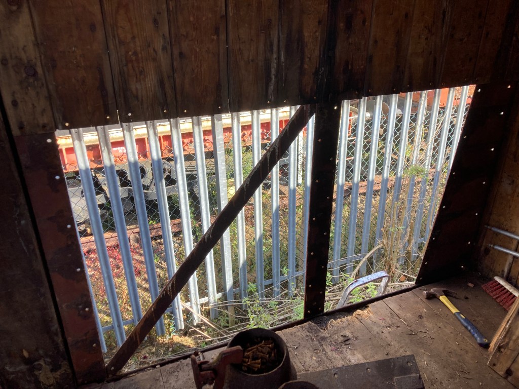 Following the defeat with the springs, Tim and Annika were joined down the siding by Colin, Paul, Steve, Gareth, Mark, and Jason, for another team effort in ticking a job off the list. BR van B786075 has suffered from a leaking roof for the past few months and during the freight running weekend Tim noticed from the footbridge some rather large cracks in the roof canvass, which has caused the roof to get wet and sag in several places. With no facilities available to replace the roof it was decided to sheet it over to get through the winter. Hopefully this will allow the interior to dry out a bit and save further damage to the floor. However, before the tarpaulin could be thrown over the roof a small repair was needed, so it was opened out for inspection. It should be noted that no trains were running on Saturday……we would never obstruct the line on a running day!