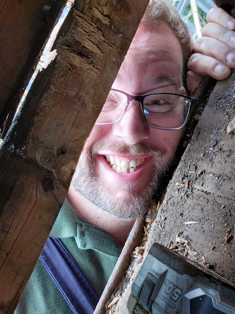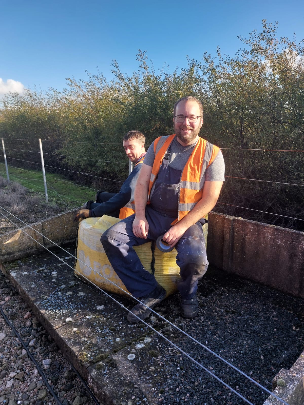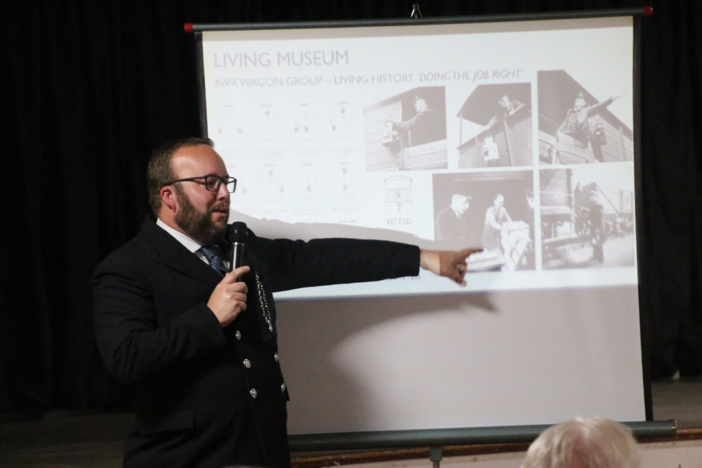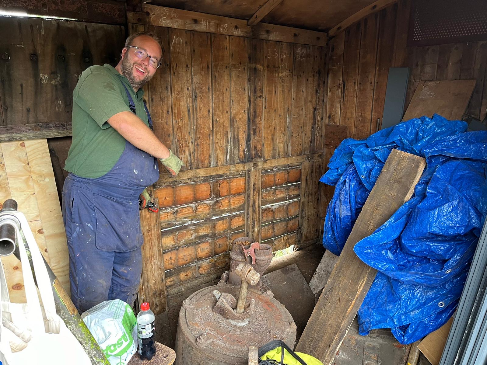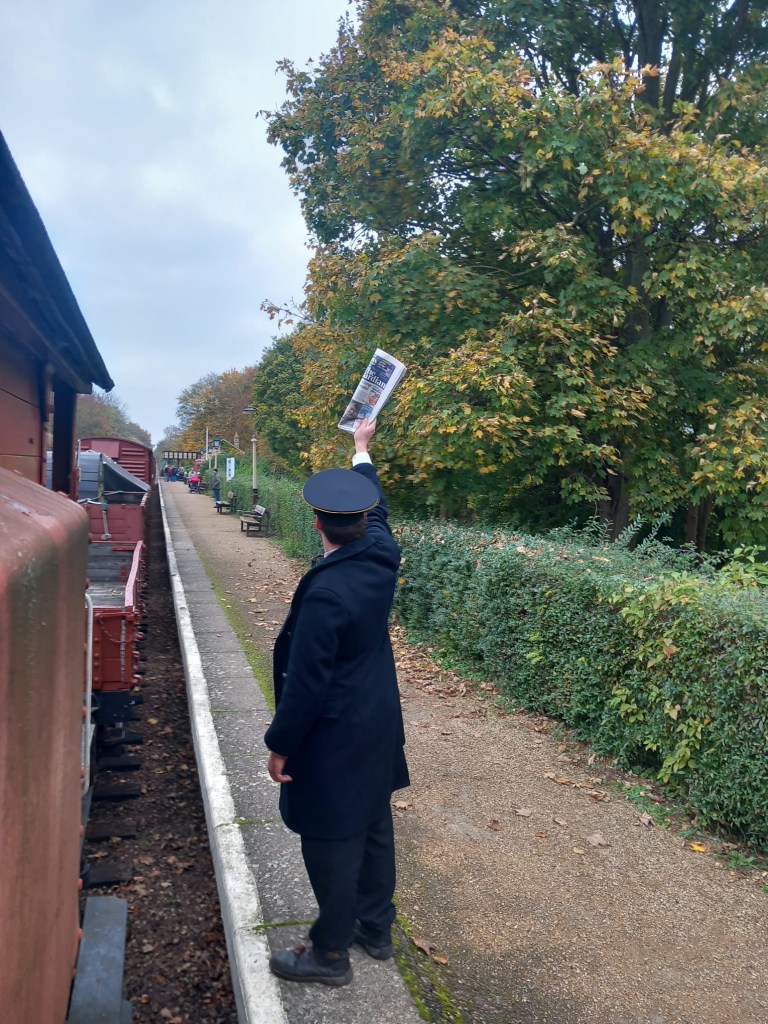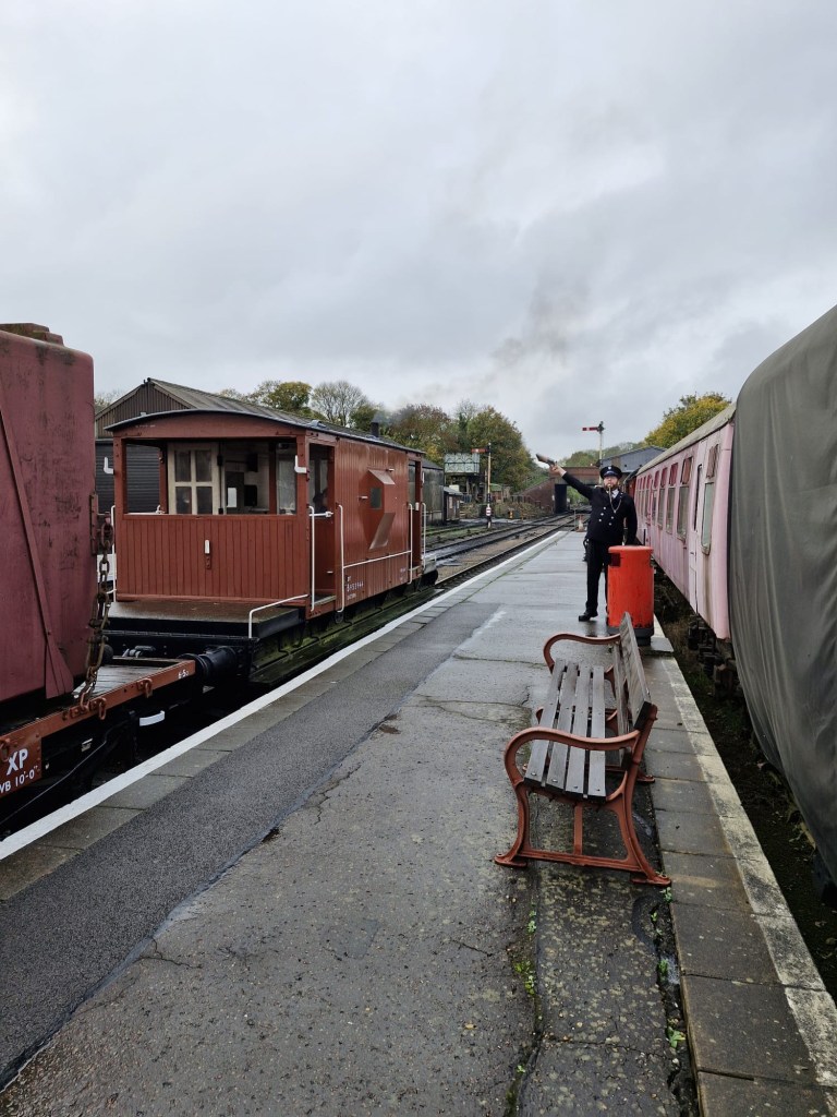 Following the defeat with the springs, Tim and Annika were joined down the siding by Colin, Paul, Steve, Gareth, Mark, and Jason, for another team effort in ticking a job off the list. BR van B786075 has suffered from a leaking roof for the past few months and during the freight running weekend Tim noticed from the footbridge some rather large cracks in the roof canvass, which has caused the roof to get wet and sag in several places. With no facilities available to replace the roof it was decided to sheet it over to get through the winter. Hopefully this will allow the interior to dry out a bit and save further damage to the floor. However, before the tarpaulin could be thrown over the roof a small repair was needed, so it was opened out for inspection. It should be noted that no trains were running on Saturday……we would never obstruct the line on a running day!