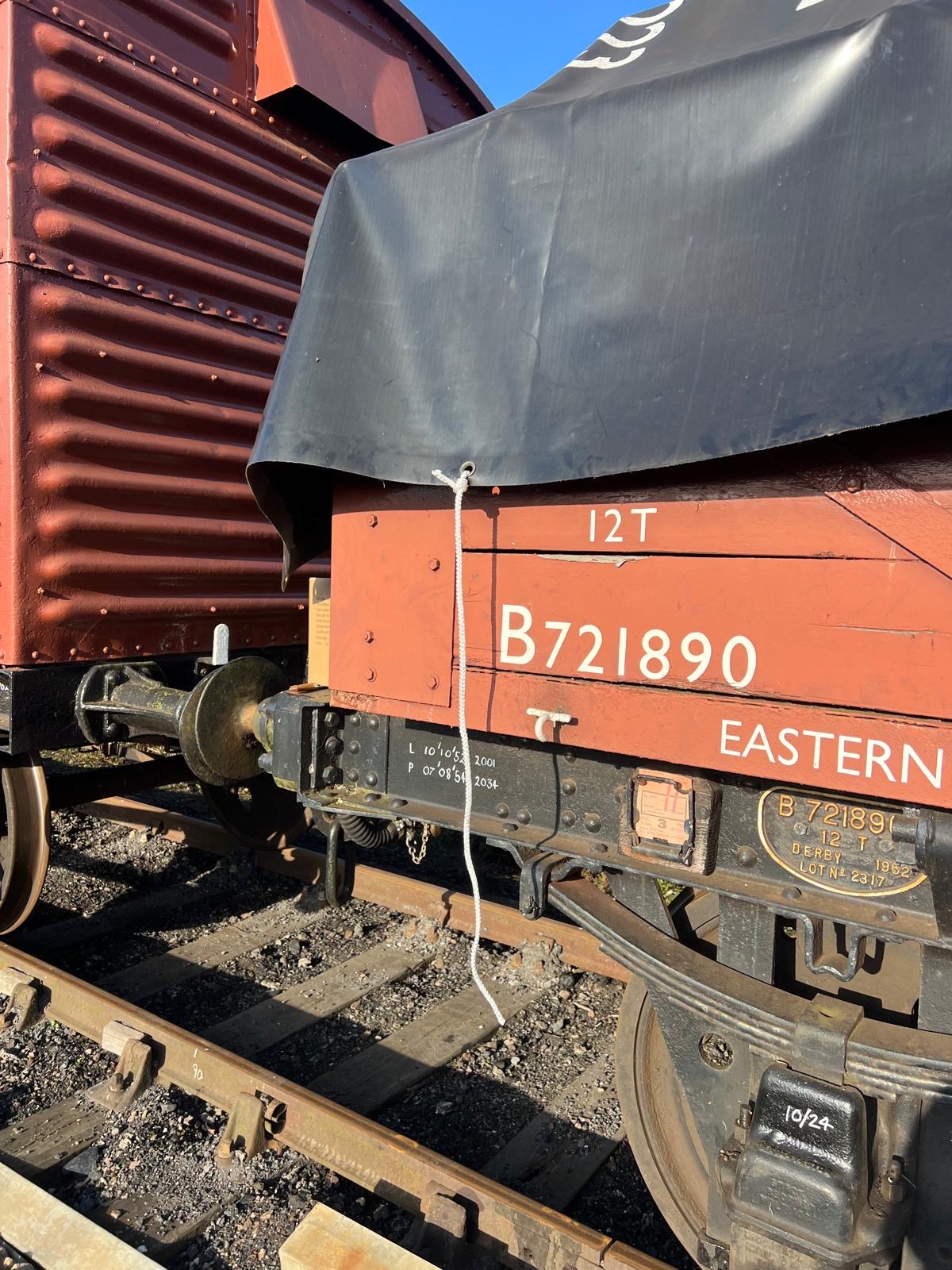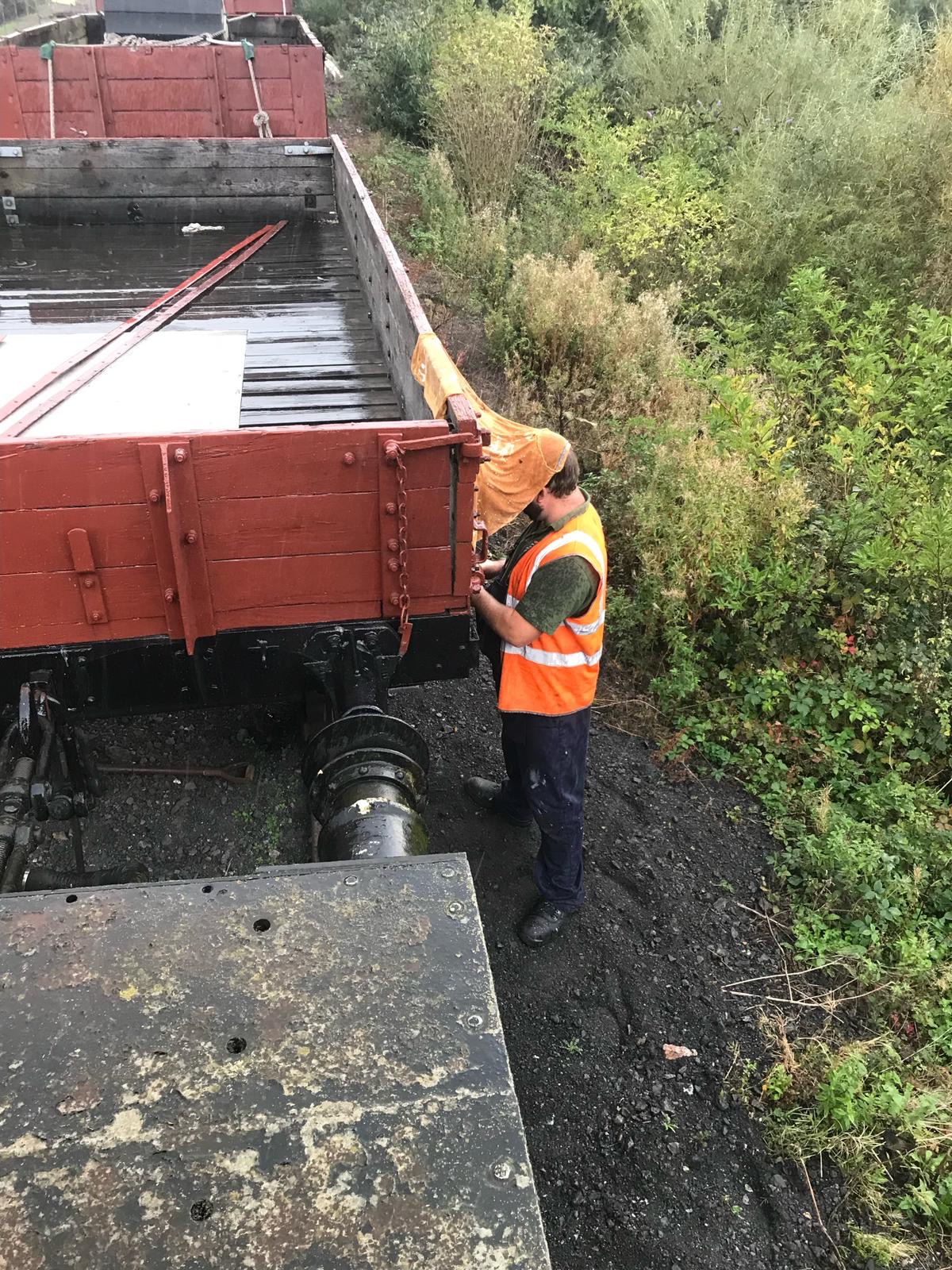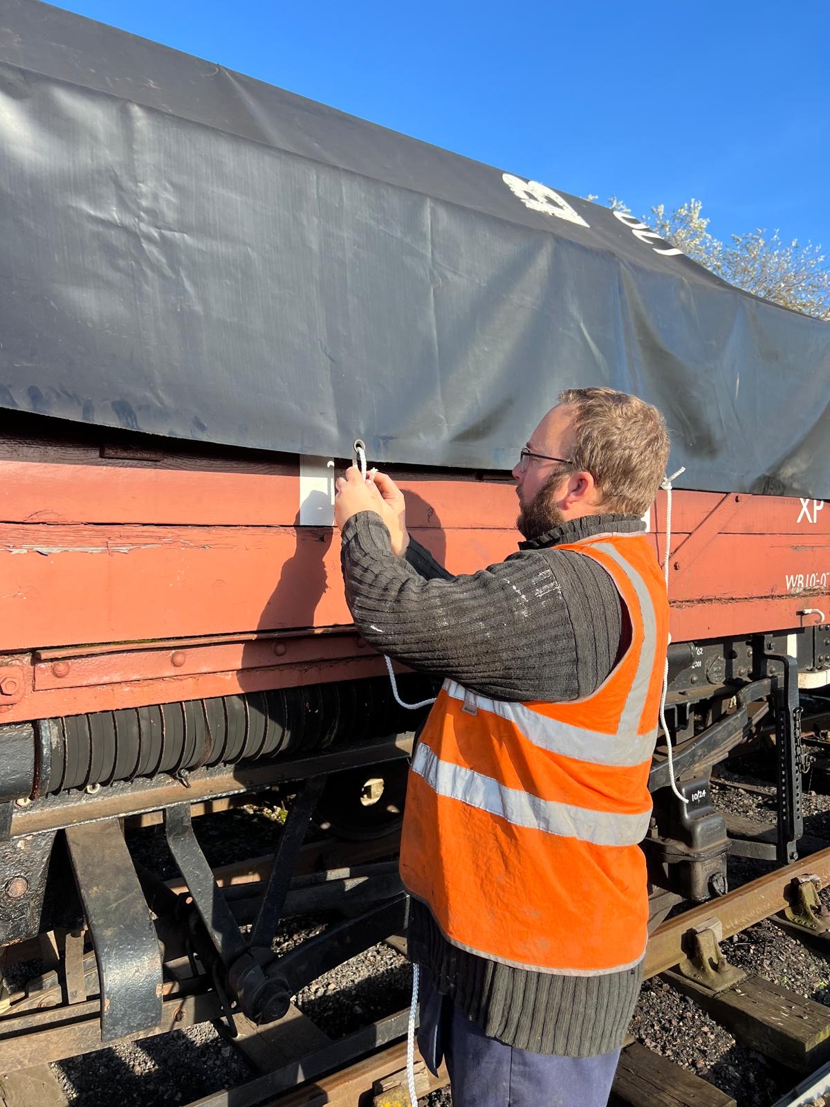 Meanwhile, down the siding with the running rake, Tim and Annika set about the job of replacing the ropes on the tarpaulin covering the BR Shoc Open. The ropes have deteriorated over time and it was decided better to do it before the winter for fear of them snapping and the sheet blowing off.