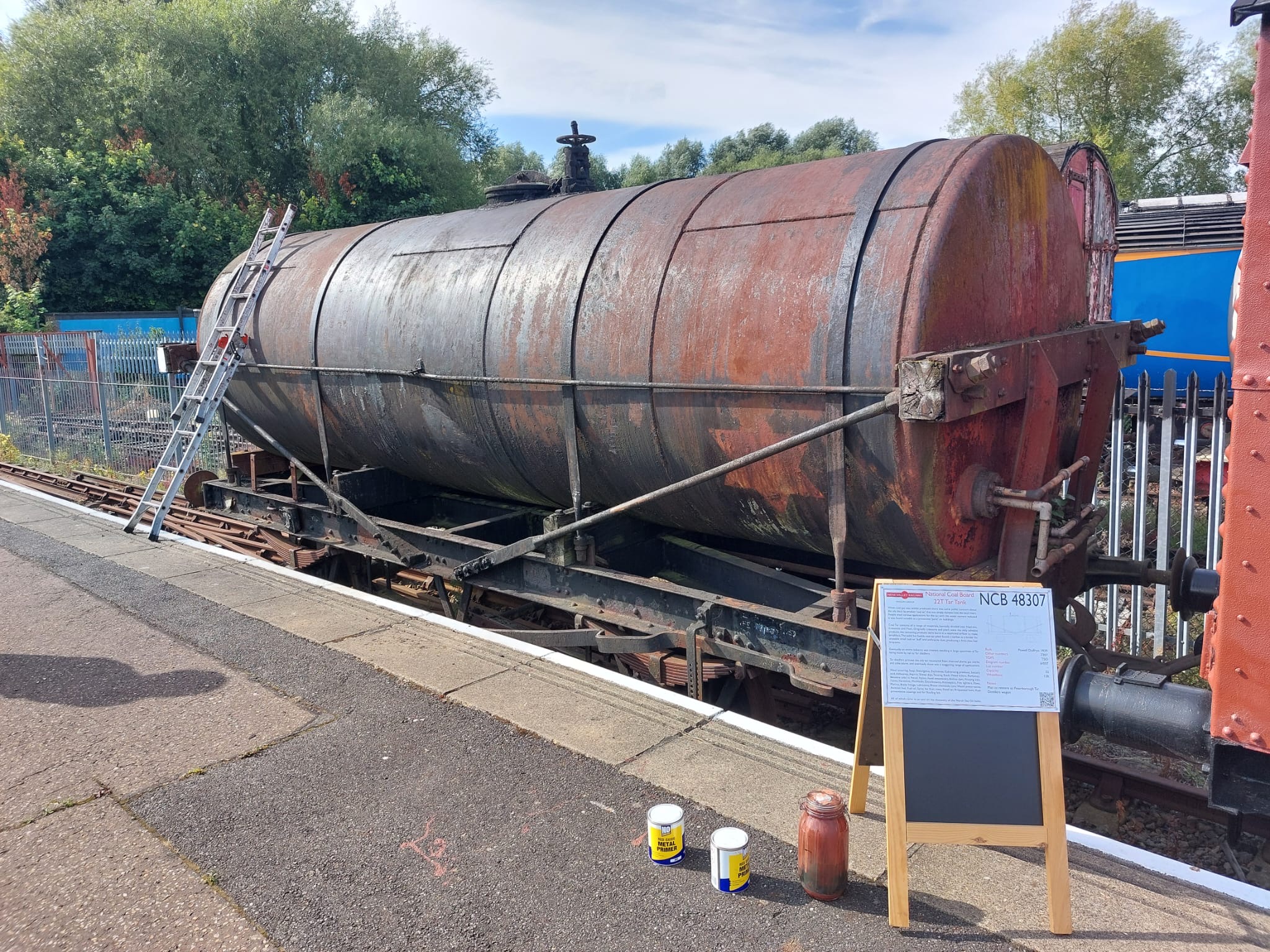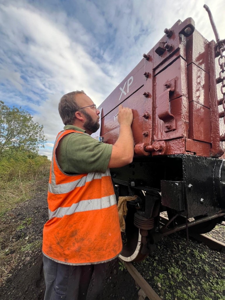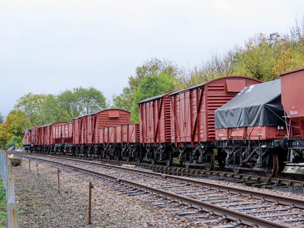 Meanwhile, down the siding with the running rake, Tim and Annika set about the job of replacing the ropes on the tarpaulin covering the BR Shoc Open. The ropes have deteriorated over time and it was decided better to do it before the winter for fear of them snapping and the sheet blowing off.