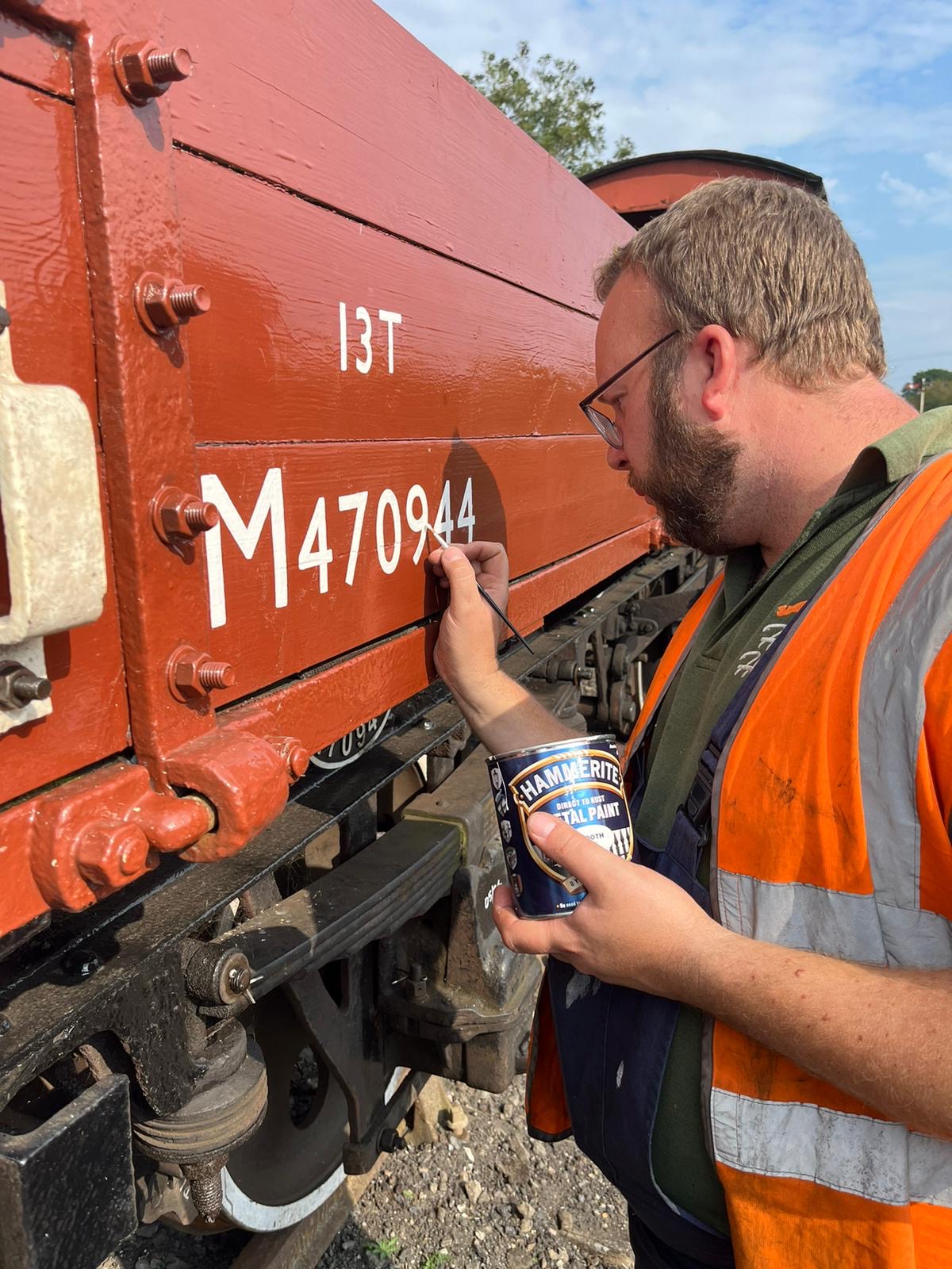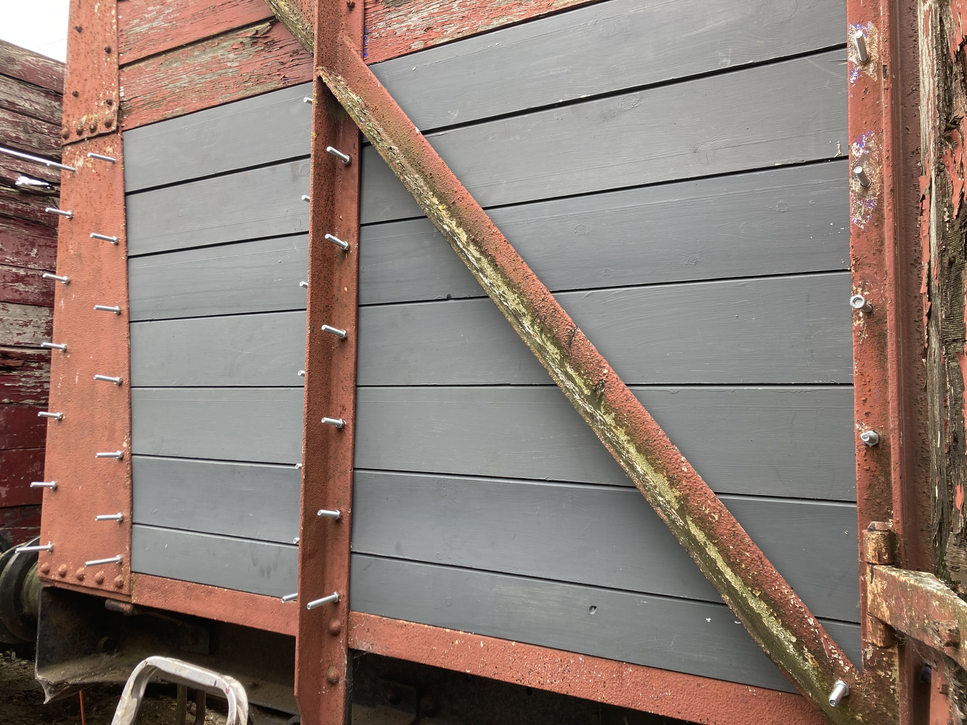 At the other end of the siding, Stu and Josh were putting the finishing touches to LMS Medfit M470944. A few extra coach screws were needed in the top rails, then the label clips were fitted both sides. This vehicle is now complete!